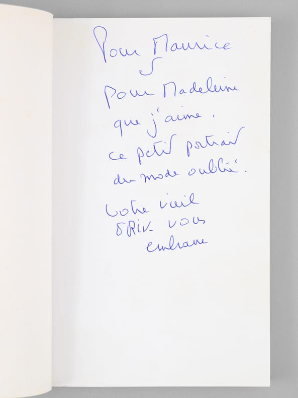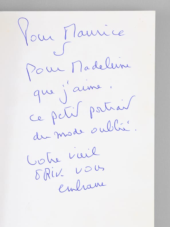 L'exemplaire est enrichi d'un bel envoi "Pour Maurice, pour Madeleine que j'aime, ce petit portrait du mode oublié. Votre vieil Erik vous embrasse". L'écrivain Erik Orsenna a été élu en 1998 à l'Académie Française. Bon état (légères rouss. sur tranche en tête). Comme à son habitude, Maurice Druon a plié l'angle d'un feuillet qui avait retenu son attention.