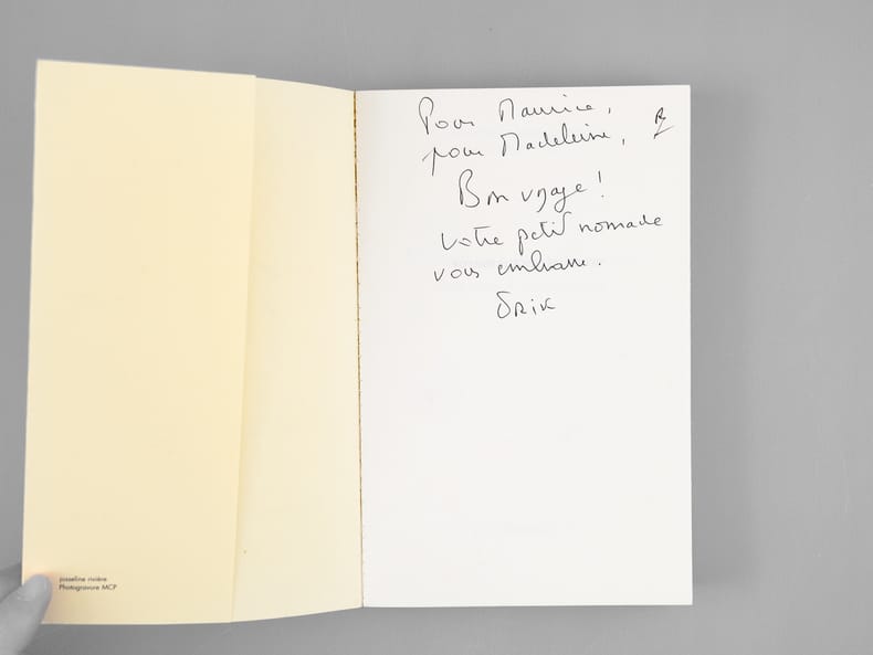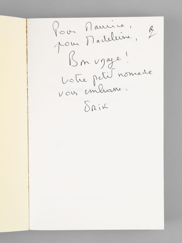 L'exemplaire est enrichi d'un bel envoi à Maurice et Madeleine Druon. "Pour Maurice, pour Madeleine, Bon voyage ! Votre petit nomade vous embrasse. Erik". L'écrivain Erik Orsenna a été élu en 1998 à l'Académie Française. Bon état (qq. rouss. sur couv.).