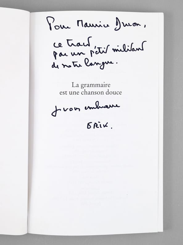 L'exemplaire est enrichi d'un bel envoi "Pour Maurice Druon, ce tract par un petit militant de notre langue. Je vous embrasse. Erik". L'écrivain Erik Orsenna a été élu en 1998 à l'Académie Française au XVIIe fauteuil. Bon état.
