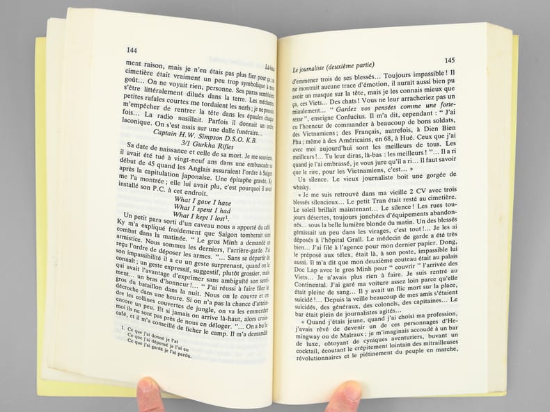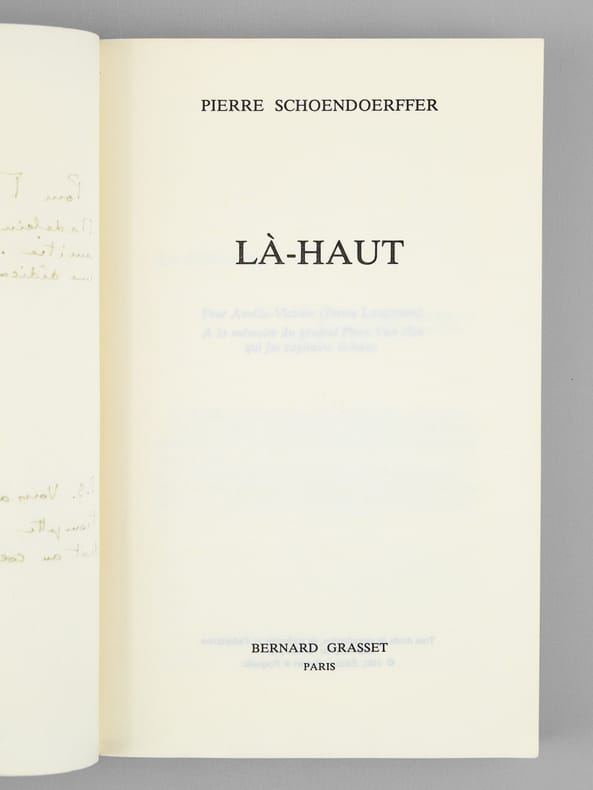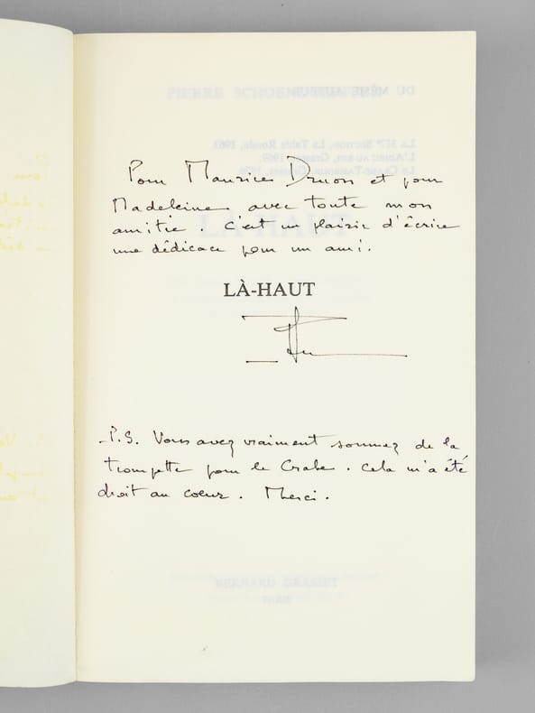 Bel envoi de Pierre Schoendoerffer "Pour Maurice Druon et pour Madeleine, avec toute mon amitié. C'est un plaisir d'écrire une dédicace pour un ami. P.S. : Vous avez vraiment sonnez (sic) de la trompette pour le Crabe. Cela m'a été droit au coeur. Merci". Bon état (couv. très lég. frottée)