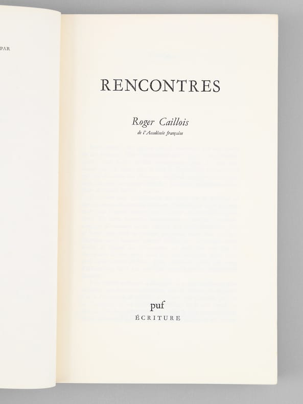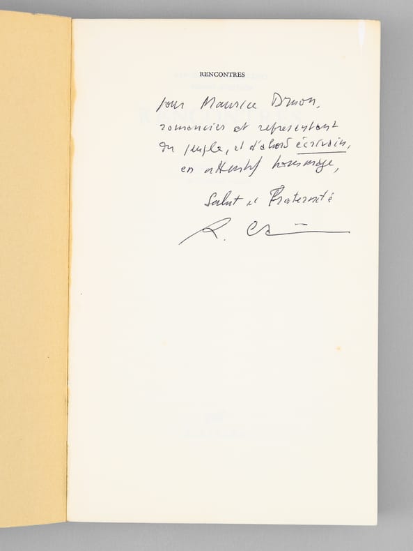 Bel envoi de Roger Caillois "Pour Maurice Druon, romancier et représentant du peuple, et d'abord écrivain, en attentif hommage, Salut et Fraternité". Roger Caillois (1913-1978) avait été est élu à l'Académie française en 1971, au fauteuil 3, succédant ainsi à Jérôme Carcopino et précédant Marguerite Yourcenar. Belle provenance pour cet exemplaire de son dernier recueil, dédicacé au futur secrétaire perpétuel de l'Académie Française, Maurice Druon. Bon état.