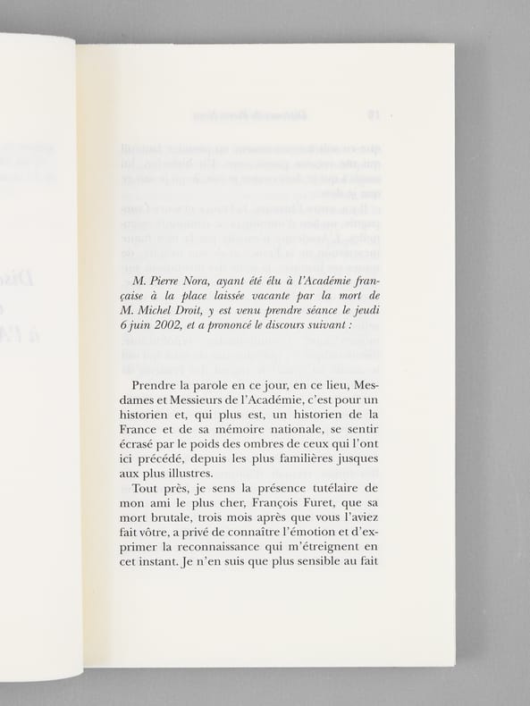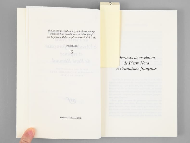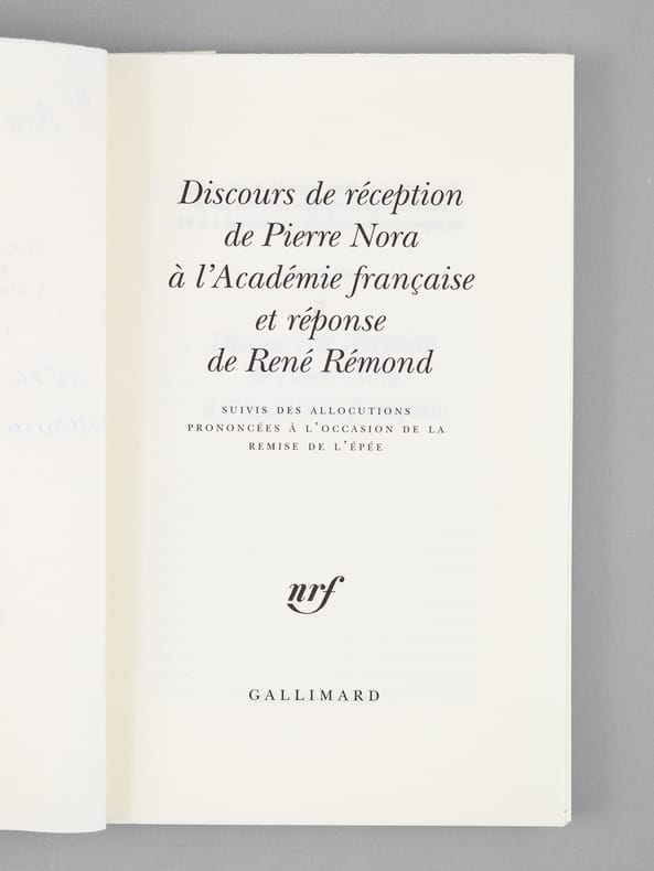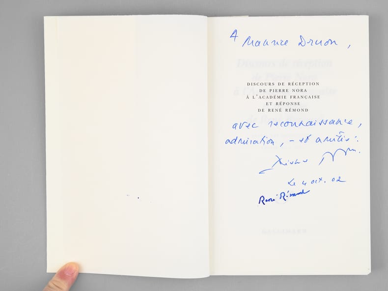 Envoi autographe signé de l'historien Pierre Nora "A Maurice Druon, avec reconnaissance, admiration, - et amitié", et signature autographe de René Rémond. Remarquable exemplaire du tirage de tête, signé par Pierre Nora et René Rémond, et de superbe provenance, de la bibliothèque de Maurice Druon, Secrétaire Perpétuel de l'Académie Française de 1985 à 1999. Bel exemplaire.
