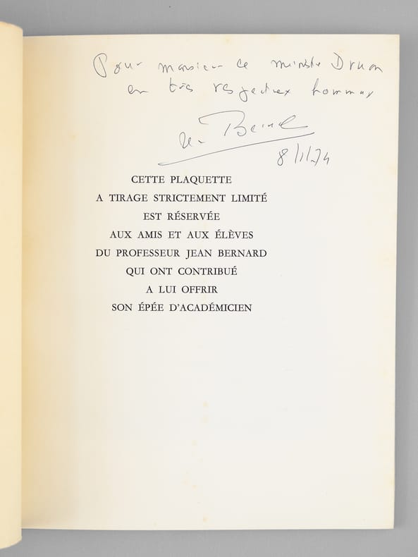 Envoi du Professeur Jean Bernard "Pour Monsieur le Ministre Druon, en très respectueux hommage". Bon état.