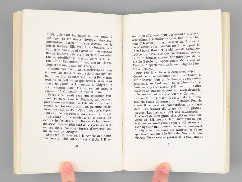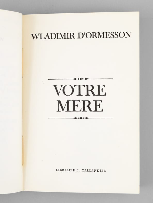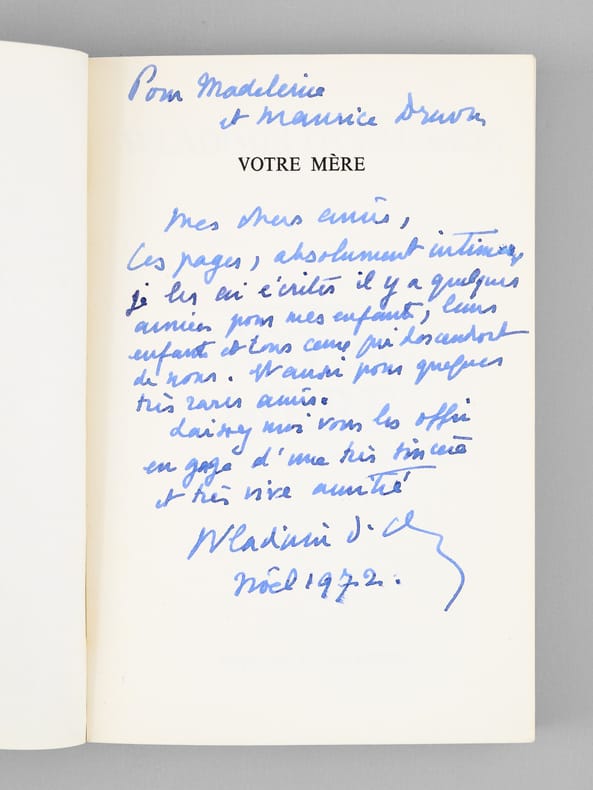 Rare exemplaire de cet ouvrage tiré à petit nombre, enrichi d'un superbe envoi de Wladimir d'Ormesson "Pour Madeleine et Maurice Druon, Mes Chers Amis, Ces pages, absolument intimes, je les ai écrites il y a quelques années pour mes enfants, leurs enfants et tous ceux qui descendront de nous. Et aussi pour quelques très rares amis. Laissez moi vous les offrir en gage d'une très sincère et très vive amitié. Wladimir d'Ormesson Noël 1972". Rare exemplaire de cet ouvrage évoquant l'épouse disparue de Wladimir d'Ormesson, Concepción "Conchita" de Malo y Zayas-Bazán (1888-1966), mère de ses 6 enfants. Superbe provenance : de la bibliothèque de Maurice Druon, Secrétaire Perpétuel de l'Académie Française de 1985 à 1999. Bon état (très petit frott. en couv., 2 annotations marginales de la main de Maurice Druon).