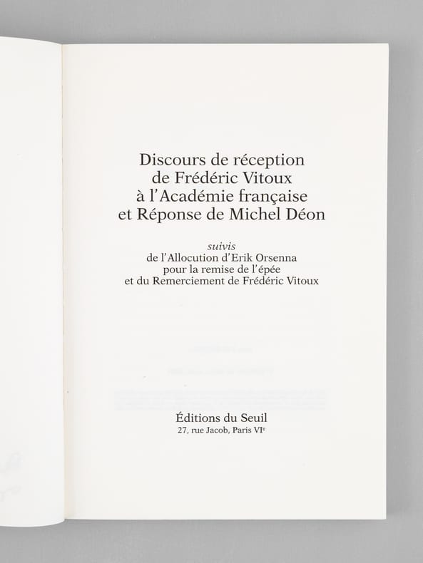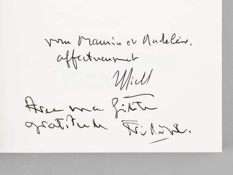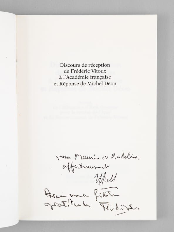 Dédicace de Michel Déon "Pour Maurice et Madeleine, affectueusement. Michel" et de Frédéric Vitoux : "Avec ma fidèle gratitude. Frédéric". Bon exemplaire de superbe provenance : de la bibliothèque de Maurice Druon, ancien Secrétaire Perpétuel de l'Académie Française de 1985 à 1999. Bon exemplaire.