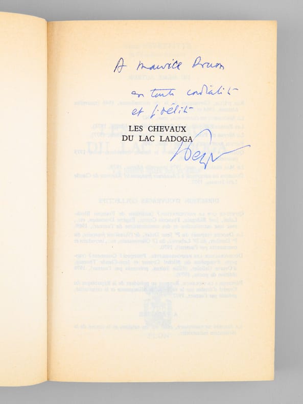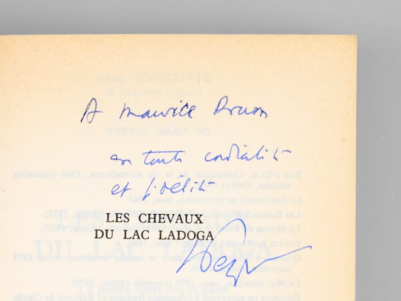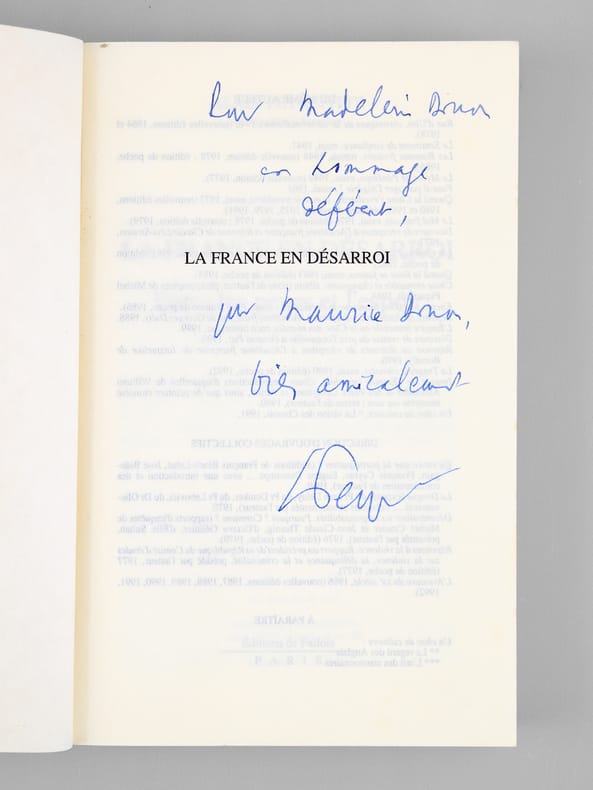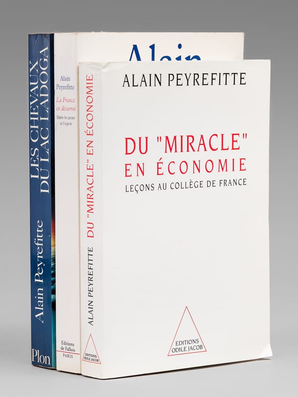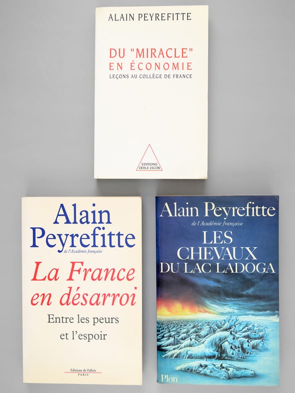 Dédicaces d'Alain Peyrefitte à Maurice Druon (et Madeleine, son épouse). Bon état (qq. rouss. sur tranches). Prix du lot, non séparable.