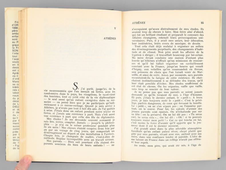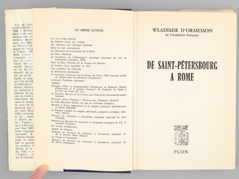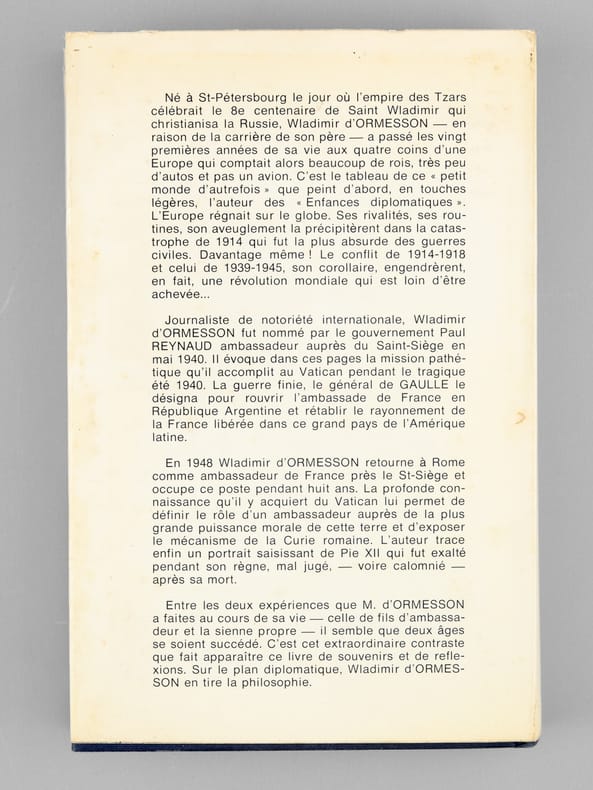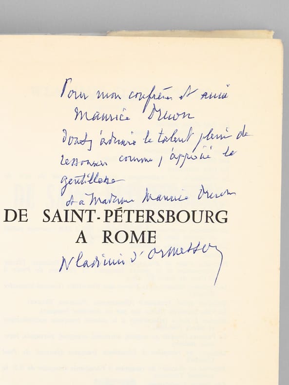 Bel envoi de Wladimir d'Ormeson "pour mon confrère et ami Maurice Druon dont j'admire le talent plein de ressources comme j'apprécie la gentillesse et à Madame Maurice Druon". Belle provenance pour ce remarquable ouvrage de souvenirs : de la bibliothèque de Maurice Druon, futur Secrétaire Perpétuel de l'Académie Française, qui a signalé au feutre plusieurs passages de l'ouvrage.