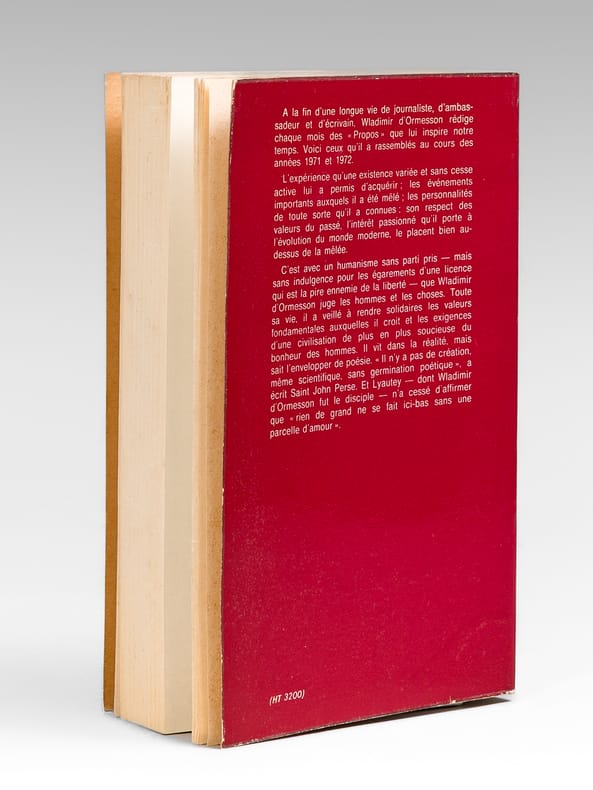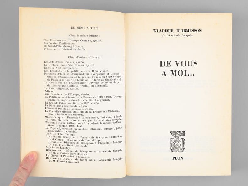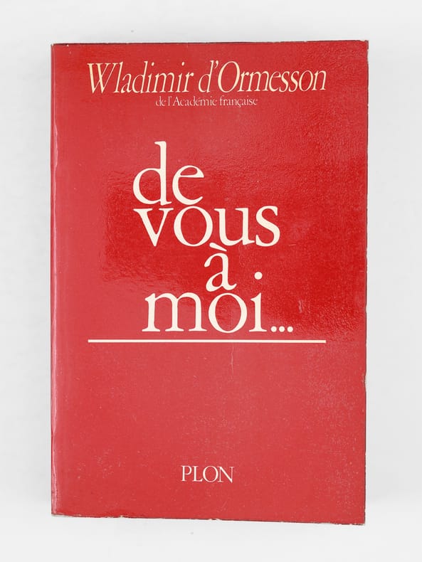 Bel envoi de Wladimir d'Ormeson "pour Madeleine et Maurice Druon ce bavardage, qui leur redira ma très sincère affection". Belle provenance pour ce remarquable ouvrage de souvenirs : de la bibliothèque de Maurice Druon, futur Secrétaire Perpétuel de l'Académie Française.