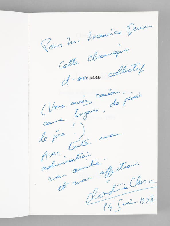 Bel envoi de Christine Clerc "Pour M. Maurice Druon, cette chronique d'un "suicide" collectif (vous aviez raison, comme toujours, de prévoir le pire !) [ ... ]". On joint une carte autographe signée de l'auteur. Bon état. De la bibliothèque de Maurice Druon, Secrétaire Perpétuel de l'Académie Française de 1985 à 1999, qui a, comme à son habitude, replié l'angle de certains feuillets dont les passages avaient plus particulièrement retenu son attention.