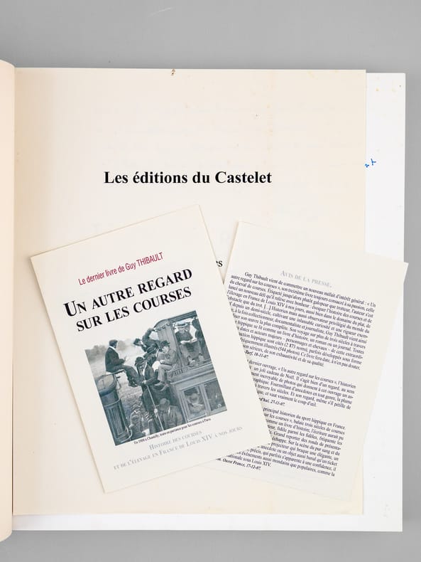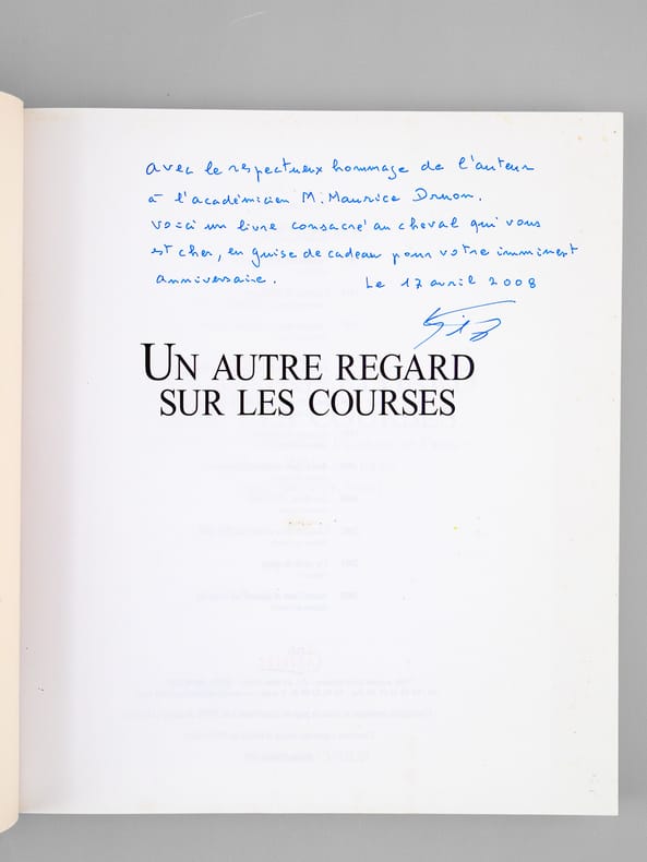 Bel envoi de l'auteur : "Avec le respectueux hommage de l'auteur à l'Académicien Maurice Druon, voici un livre consacré au cheval qui vous est cher, en guise de cadeau pour votre imminent anniversaire". Belle provenance pour cet ouvrage passionnant : de la bibliothèque du grand écrivain, grand cavalier et Secrétaire Perpétuel de l'Académie Française, Maurice Druon.
