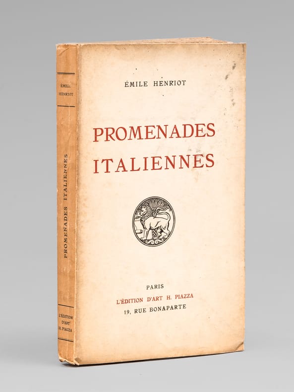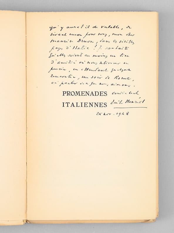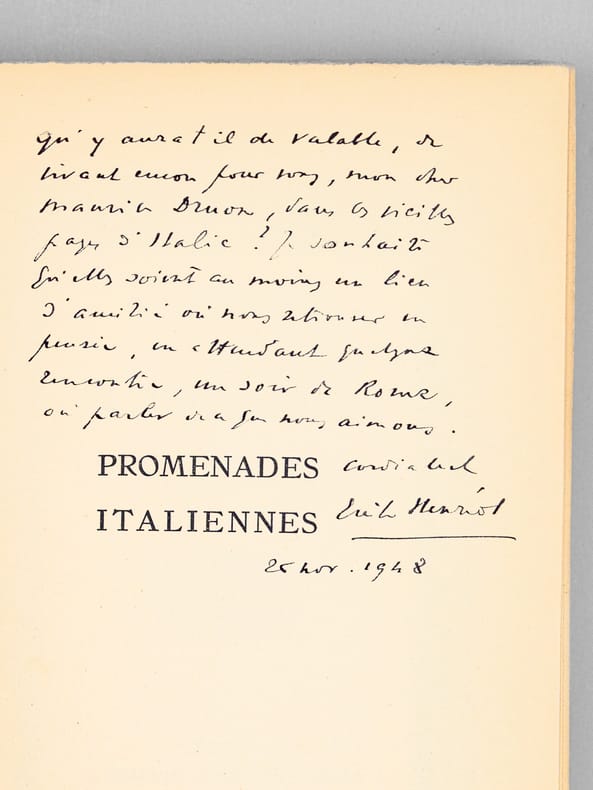 Superbe envoi d'Emile Henriot, daté de novembre 1948 : "Qu'y aura-t-il de valable, de vivant encore pour vous, mon cher Maurice Druon, dans ces vieilles pages d'Italie ? Je souhaite qu'elles soient au moins un lien d'amitié où vous retrouvez en pensée, en attendant quelque rencontre, un soir de Rome où parler de ce que nous aimons. Cordialement". Bon état (couv. lég. frottée)