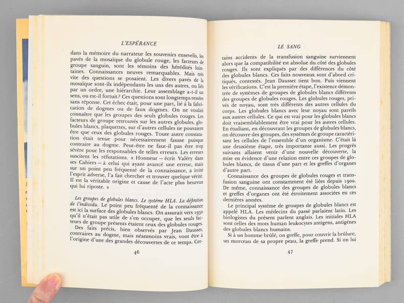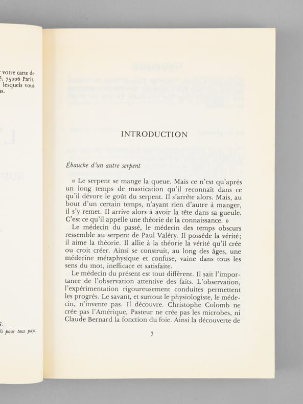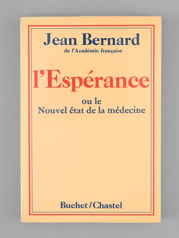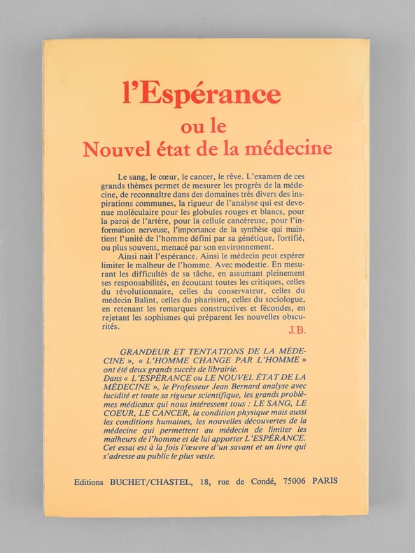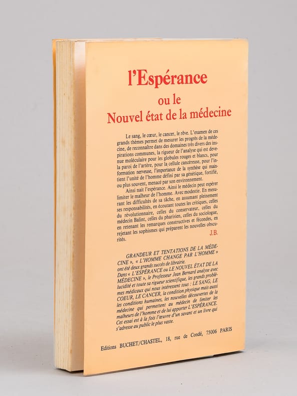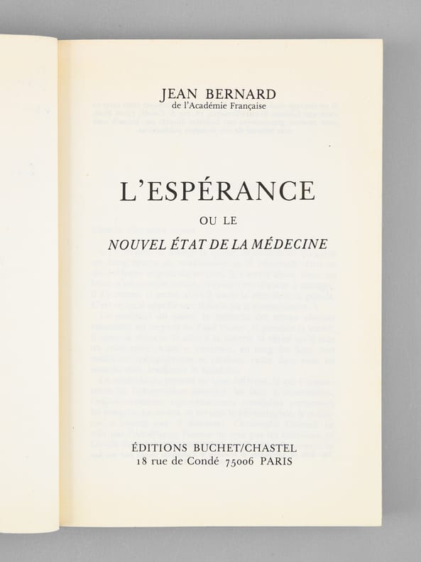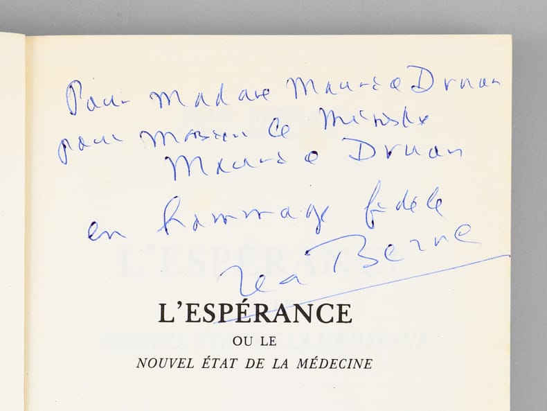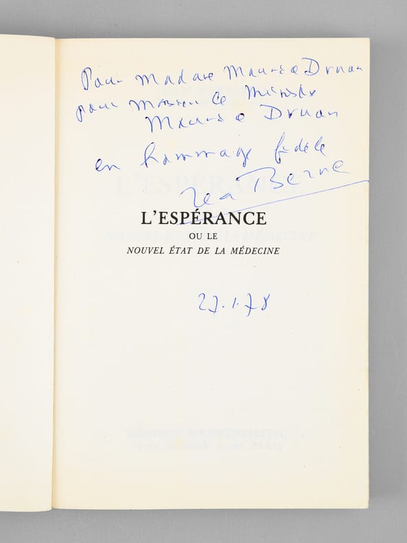 Envoi de l'auteur à Maurice Druon et à son épouse: "Pour Madame Maurice Druon, pour monsieur le Ministre Maurice Druon, en hommage fidèle.". Jean Bernard et le dédicataire étaient tous deux académiciens. Maurice Druon (1918-2009), auteur notamment de la célèbre saga historique des Rois maudits, avait été élu à l'Académie Française en 1968. Il en devint le Secrétaire Perpétuel, de 1985 à 1999. L'auteur, quant à lui, avait été élu à l'Académie Française en 1975, au fauteuil de Marcel Pagnol. Le professeur Jean Bernard, éminent hématologue et oncologue, présida le Comité National d'Ethique de 1983 à 1993. Etat très satisfaisant (lég. rouss. sur tranches, bon état par ailleurs) pour cet exemplaire d'une origine prestigieuse.