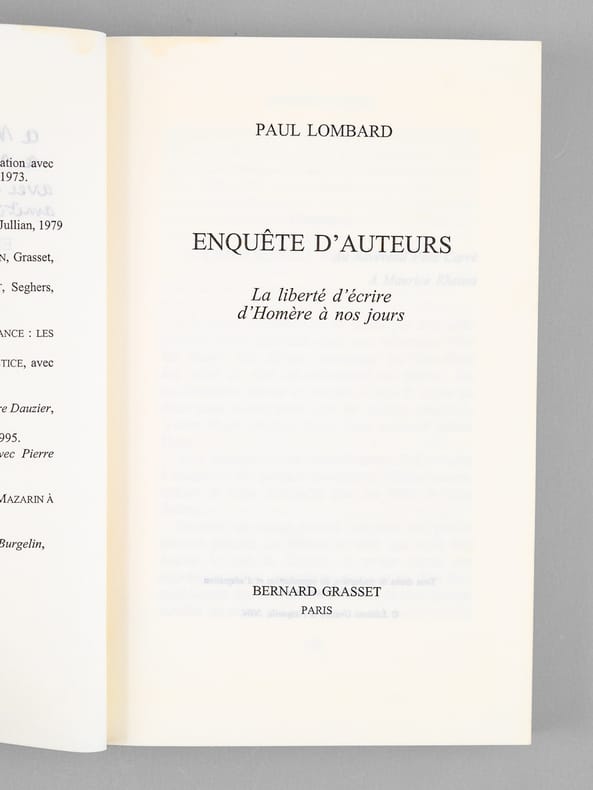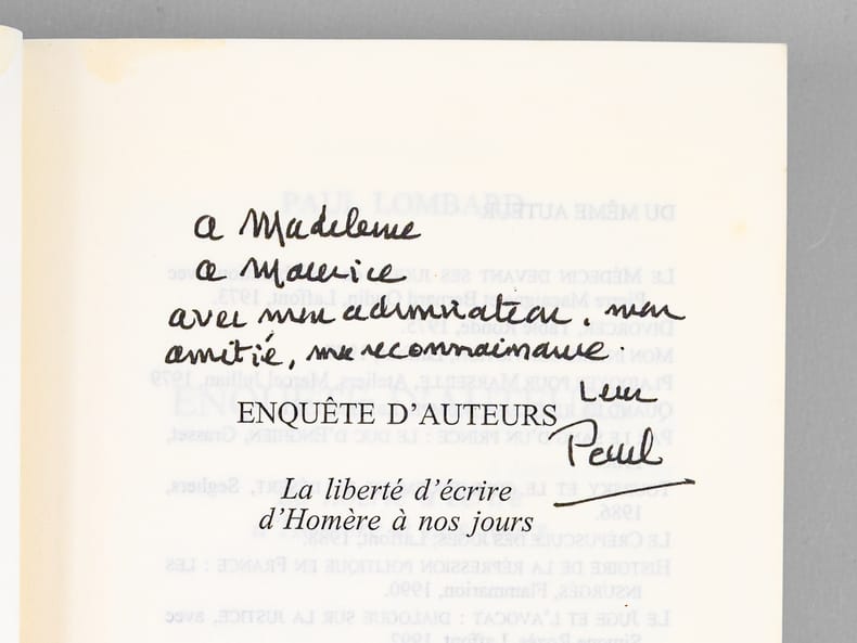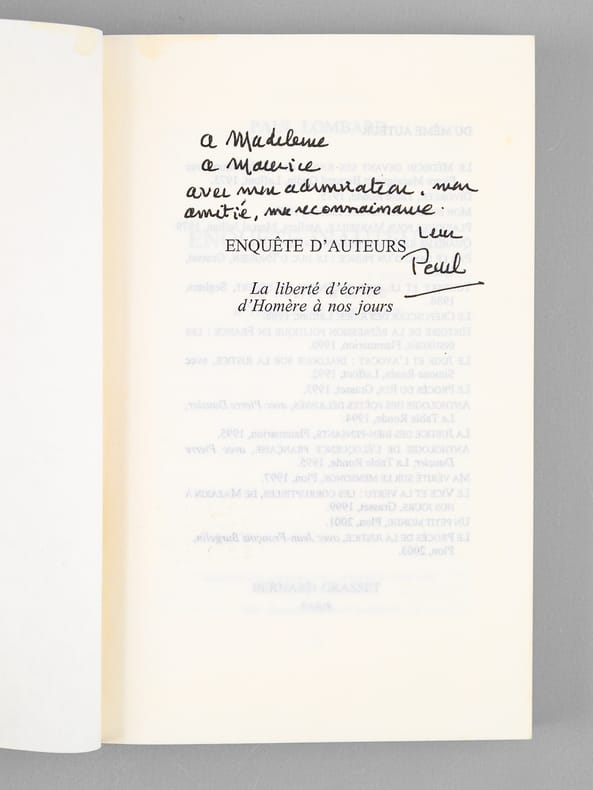 Envoi de l'auteur à Maurice Druon et à son épouse : "A Madeline, à Maurice , avec mon admiration, mon amitié, ma reconnaissance. Leur Paul." Etat très satisfaisant (couv. lég. frottée, bon état par ailleurs). Le dédicataire, Maurice Druon (1918-2009), était notamment l'auteur de la célèbre saga historique des Rois maudits. Elu à l'Académie Française en 1968, il en devint le secrétaire perpétuel, de 1985 à 1999.