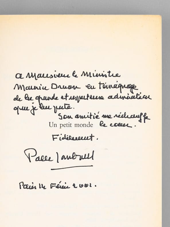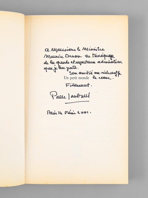 Envoi de l'auteur à Maurice Druon : "A Monsieur le Ministre Maurice Druon, en témoignage de la grande et respectueuse admiration que je lui porte. Son amitié me réchauffe le coeur. Fidèlement." Bon état. Le dédicataire, Maurice Druon (1918-2009), était notamment l'auteur de la célèbre saga historique des Rois maudits. Elu à l'Académie Française en 1968, il en devint le secrétaire perpétuel, de 1985 à 1999.
