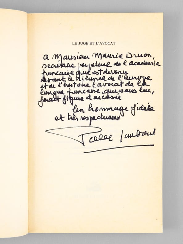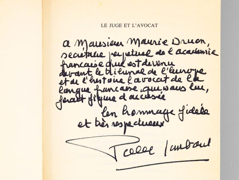 Envoi de l'auteur à Maurice Druon : "A Monsieur Maurice Druon, secrétaire perpétuel de l'académie française, qui est devenu devant le tribunal de l'Europe et de l'histoire l'avocat de la langue française, qui sans lui, ferait figure d'accusée. En homage fidèle et très respecteux." Etat très satisfaisant . Le dédicataire, Maurice Druon (1918-2009), était notamment l'auteur de la célèbre saga historique des Rois maudits. Elu à l'Académie Française en 1968, il en devint le secrétaire perpétuel, de 1985 à 1999.