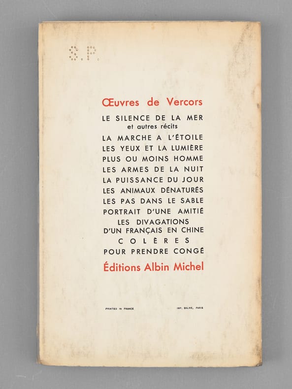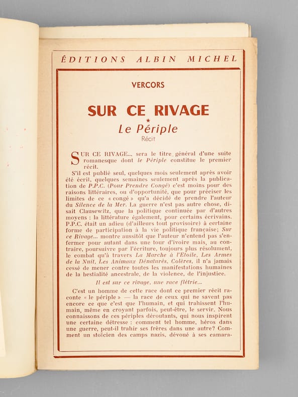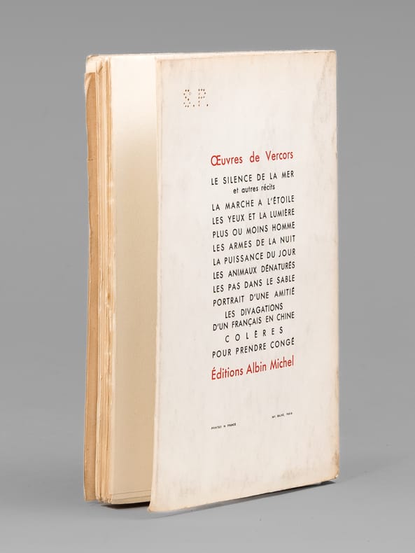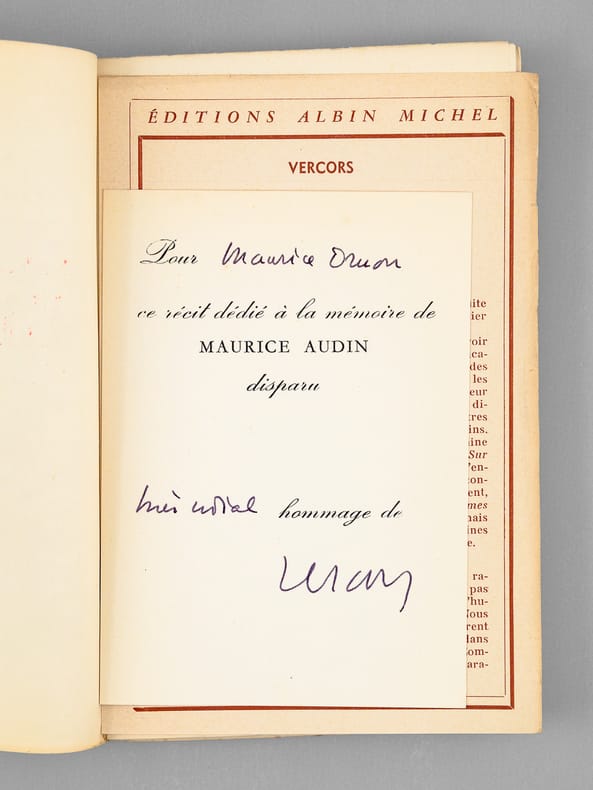 L'ouvrage est complet du "Prière d'insérer" et on joint un carte pré-imprimée, remplie par Vercors : "Pour Maurice Druon, ce récit dédié à la mémoire de Maurice Audin disparu, très cordial hommage de Vercors". Bon état pour le premier tome de cette série. L'ouvrage est consacré au thème de la torture : comment un ancien résistant devient un tortionnaire... Superbe provenance, de la bibliothèque du grand écrivain Maurice Druon, Secrétaire Perpétuel de l'Académie Française de 1985 à 1999 et immortel auteur avec son oncle Joseph Kessek du "Chant des Partisans" .