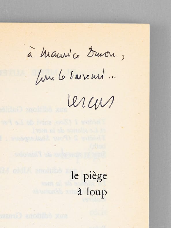 Ouvrage dédicacé par Vercors : "à Maurice Druon, pour le souvenir...". Superbe provenance, de la bibliothèque du grand écrivain Maurice Druon, Secrétaire Perpétuel de l'Académie Française de 1985 à 1999 et immortel auteur avec son oncle Joseph Kessel du "Chant des Partisans". Bon état