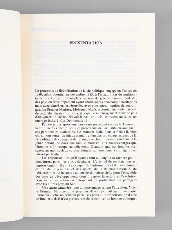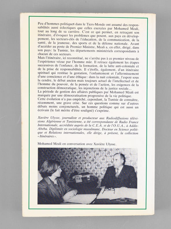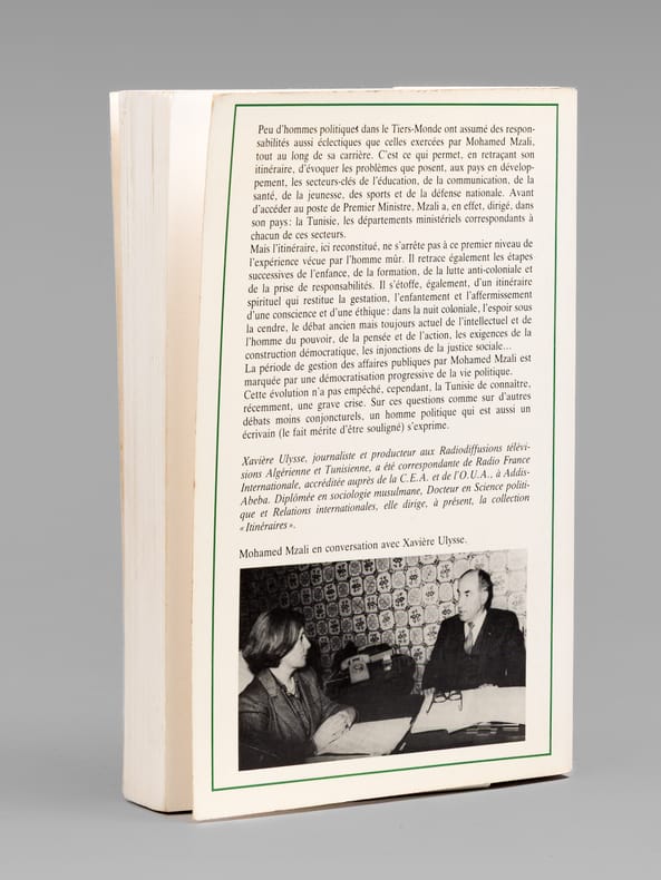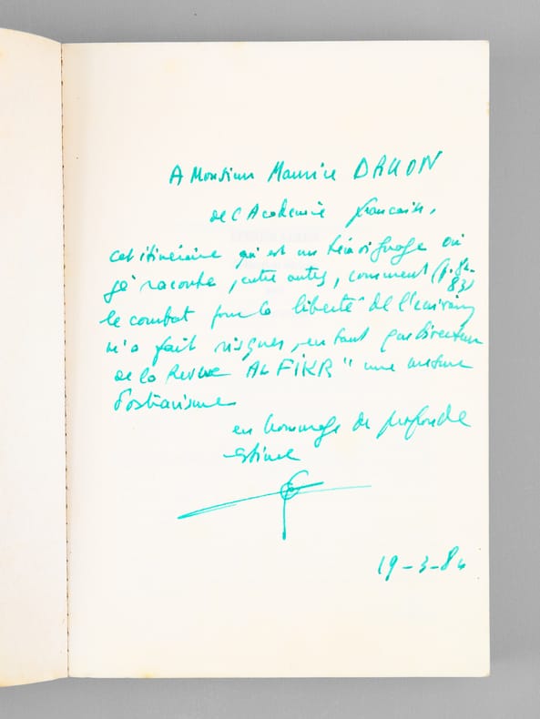Bel envoi de Mohammed Mzali, alors premier ministre de Tunisie, "A Monsieur Maurice Druon de l'Académie Française, cet itinéraire qui est un témoignage où je raconte, entre autres, comment (p. 82-83) le combat pour la liberté de l'écrivain m'a fait risquer, en tant que directeur de la Revue "Al Fikr" une mesure d'ostracisme. En hommage de profonde estime". Bon exemplaire pour cet exemplaire dédicacé au Secrétaire Perpétuel de l'Académie Française Maurice Druon, qui a, comme à son habitude, replié l'angle de 2 feuillets dont les passages avaient plus particulièrement retenu son attention, et signalé au stylo d'assez nombreux passages.