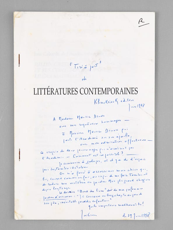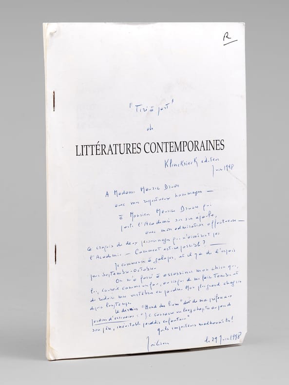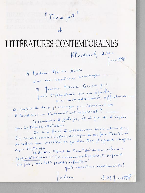 Superbe envoi autographe signé de José Cabanis de cet article, tiré-à-part de l'ouvrage collectif 'Littératures contemporaines", adressé à Madame Maurice Druon et "à Monsieur Maurice Druon qui porte l'Académie sur ses épaules, avec mon admiration affectueuse. Ce croquis de deux personnages qui n'aimèrent pas l'Académie. Comment est-ce possible ? Je commence à galoper, et il y a de l'espoir pour Septembre-Octobre. On m'a forcé à assassiner mon chien qui, lui, courait comme un fou, au risque de me faire tomber et de réduire mes vertèbres en poudre. Mon plus grand chagrin depuis longtemps. Le dernier "Monde des Livres" dit de ma préface aux "Jardins d'écrivains" : "J.C. consacre un long chapitre au parc de son père, inévitable paradis enfantin..." Quels imposteurs malhonnêtes". Bon état (couv. un peu frottée).