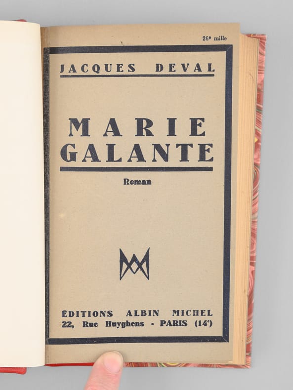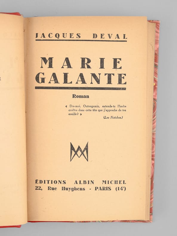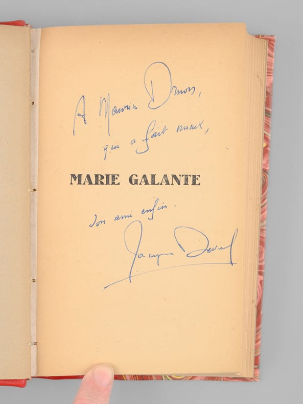 Envoi de Jacques Deval à "Maurice Druon, qui a fait mieux, son ami enfin". Bon exemplaire bien relié, de superbe provenance, dédicacé au futur Secrétaire Perpétuel de l'Académie Française Maurice Druon, auteur des "Grandes familles" et des "Rois Maudits". Ecrivain et réalisateur, Jacques Deval est le père des écrivains Gérard de Villiers et Bernard Eschasseriaux.