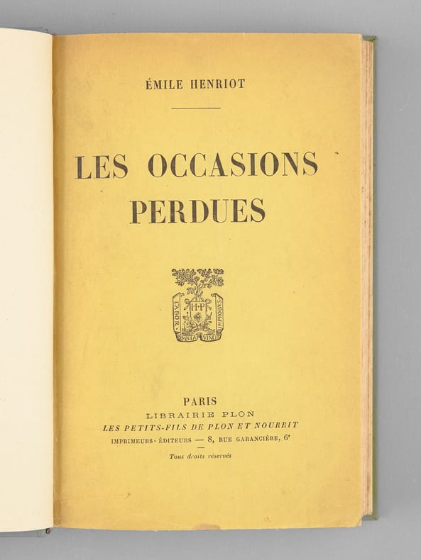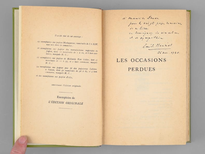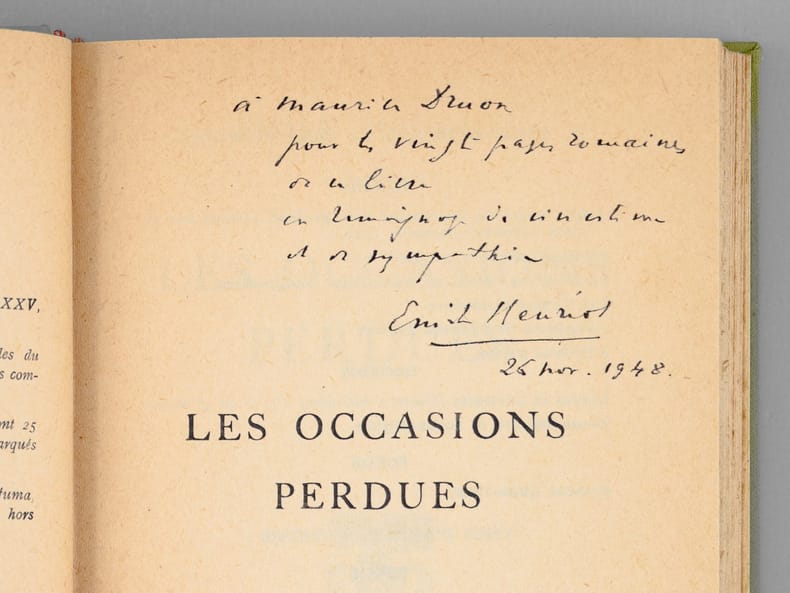 Envoi d'Emile Henriot "à Maurice Druon pour les vingt pages romaines de ce livre, en témoignage de vive estime et de sympathie". Bon exemplaire.