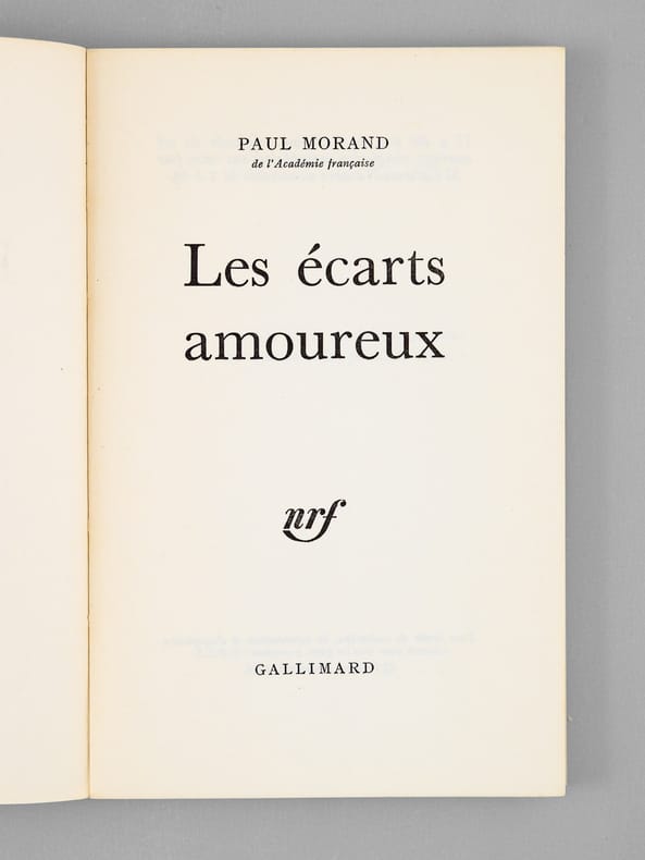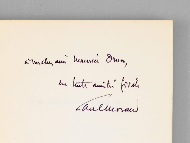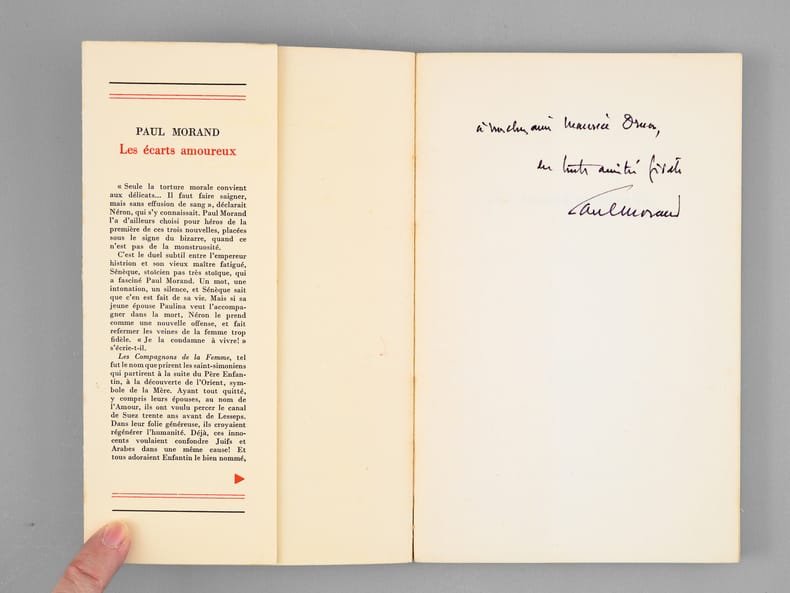 Envoi de Paul Moran "à mon cher ami Maurice Druon, en toute amitié fidèle". Bon état pour cet exemplaire de superbe provenance : de la bibliothèque de l'écrivain Maurice Druon, Secrétaire Perpétuel de l'Académie Française de 1985 à 1999