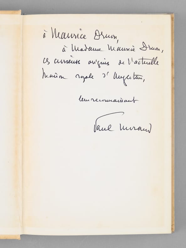 Envoi de Paul Morand "à Maurice Druon, à Madame Maurice Druon, ces curieuses origines de l'actuelle Marine Royale d'Angleterre, leur reconnaissant", P. Morand (historien par aventure)". Etat très satisfaisant (couv. un peu frottée) pour cet exemplaire de superbe provenance : de la bibliothèque de l'écrivain Maurice Druon, Secrétaire Perpétuel de l'Académie Française de 1985 à 1999