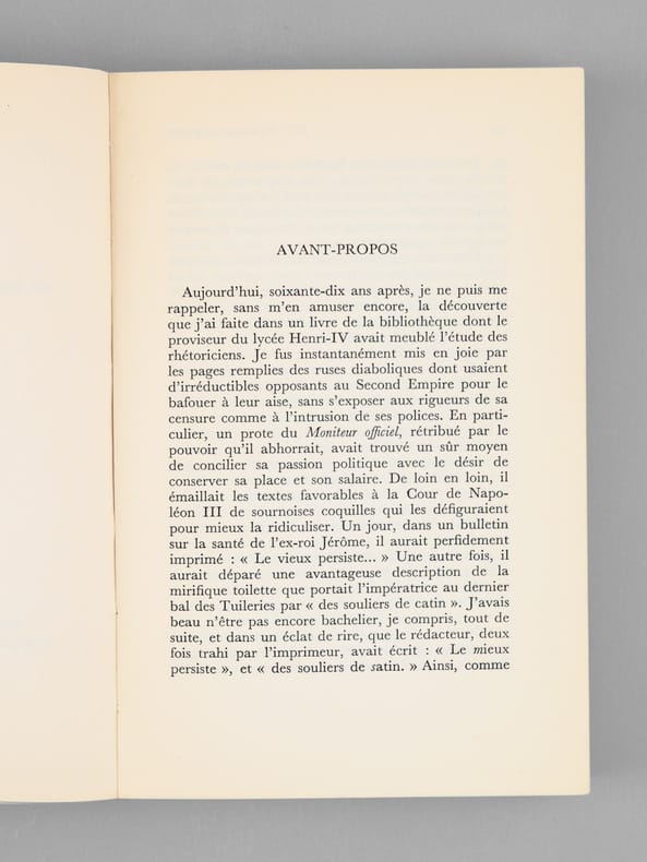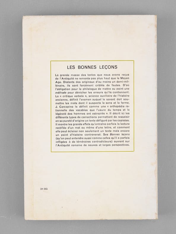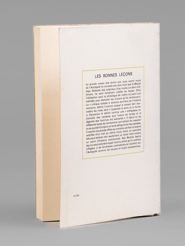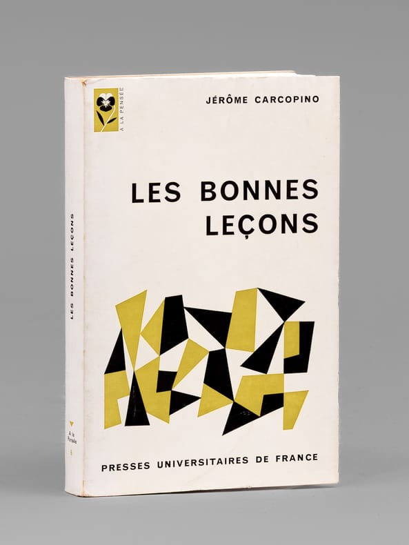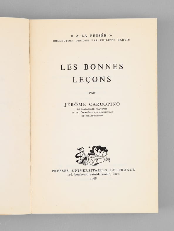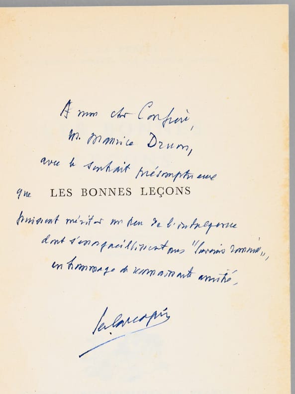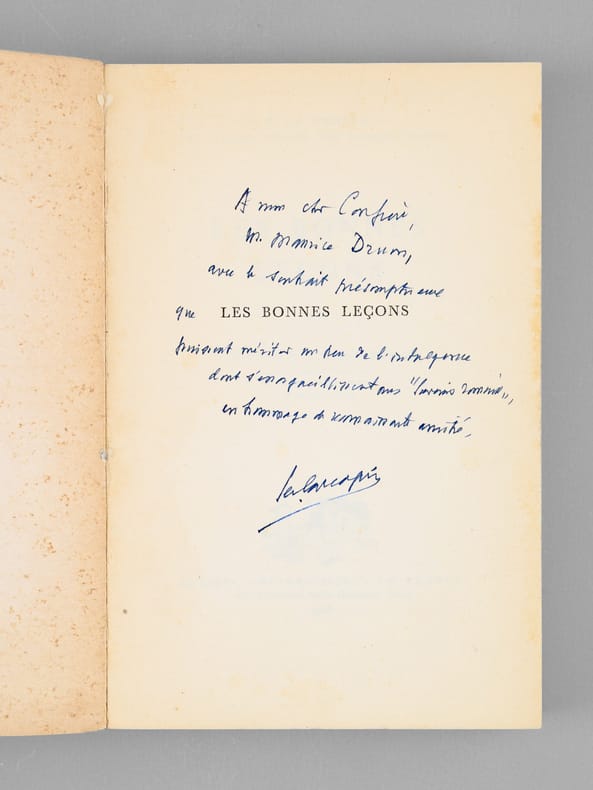 Bel envoi de Jérôme Carcopino "A mon Cher Confrère, M. Maurice Druon, avec le souhait présomptueux que 'Les Bonnes Leçons" puissent mériter un peu de l'indulgence dont s'enorgueillissent nos "Souvenirs Romains", en hommage de reconnaissante amitié". Elu à l'Académie Française en 1956, Jérôme Carcopino y avait accueillit en 1966 Maurice Druon, futur Secrétaire Perpétuel. Bon état