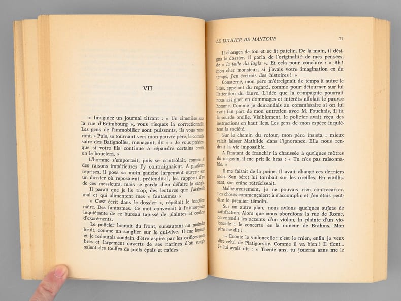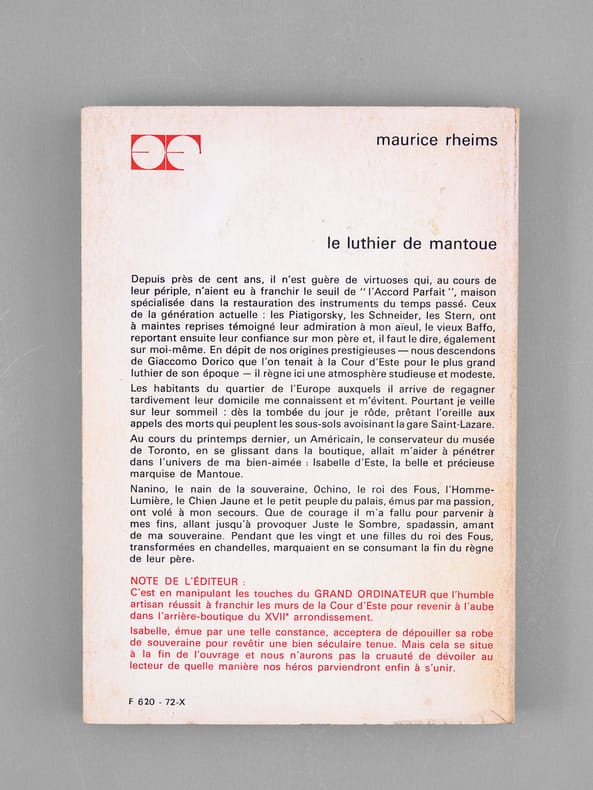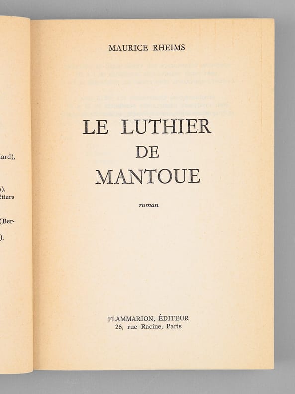 Très bel envoi de Maurice Rheims, "Exemplaire n°1 - vraiment 1. A Madeleine que j'embrasse très tendrement. A Maurice avec les hommages inquiets du "Luthier de Crémone", du Capricorne au Taureau". Bon état (couv. lég. frottée, qq. rouss. en tête, bon exemplaire par ailleurs) pour cet exemplaire du tirage ordinaire (malgré le magnifique autographe !), de superbe provenance : de la bibliothèque du grand écrivain Maurice Druon, Secrétaire Perpétuel de l'Académie Française de 1985 à 1999.