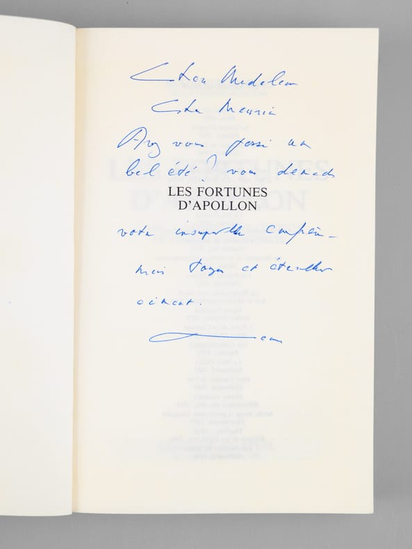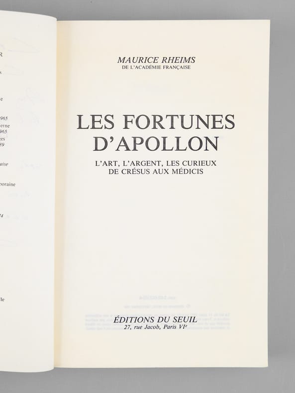 Envoi de Maurice Rheims : "Chère Madeleine, Cher Maurice, Avez-vous passé un bel été ? vous demande votre insupportable compère - mais toujours et éternellement aimant". Bon état (couv. très lég. frottée, qq. rouss. en tête, bon exemplaire par ailleurs) pour cet exemplaire de superbe provenance : de la bibliothèque du grand écrivain Maurice Druon, Secrétaire Perpétuel de l'Académie Française de 1985 à 1999.
