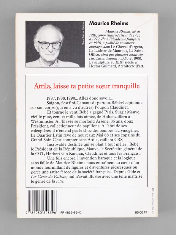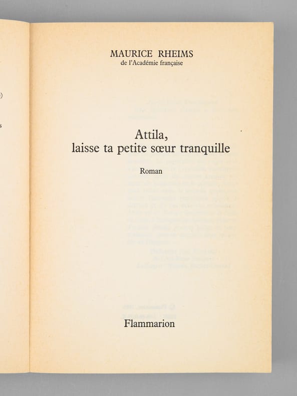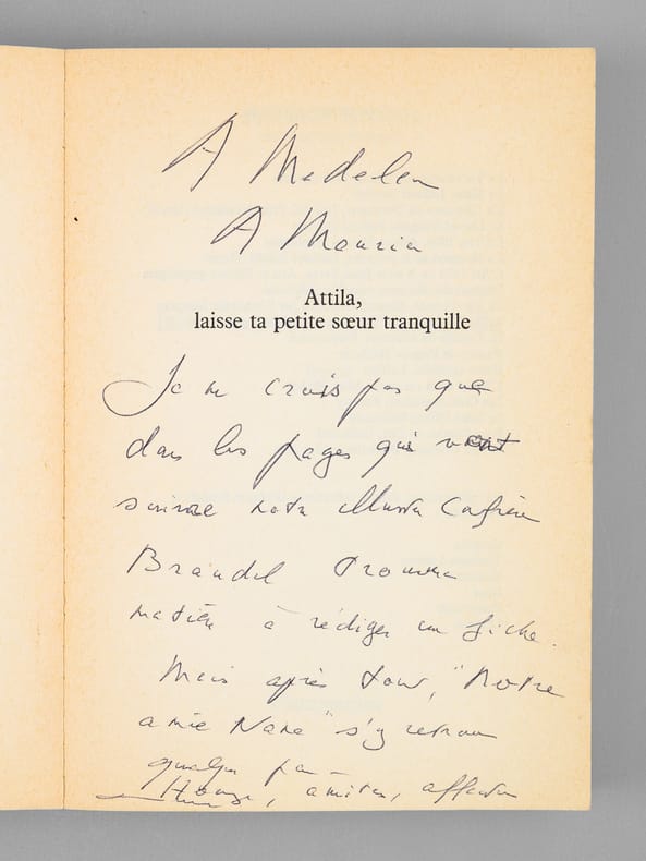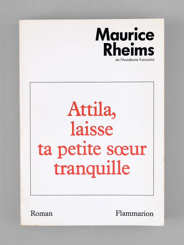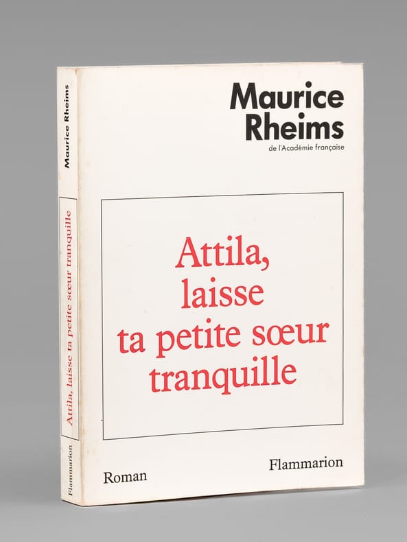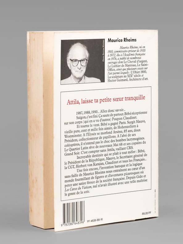 Très bel envoi de Maurice Rheims, "A Madeleine, A Maurice, Je ne crois pas que dans les pages qui vont suivre notre illustre confrère Braudel trouvera matière à rédiger une fiche. Mais après tout, "Notre amie Nane" s'y retrouvera quelque peu. Hommage, amitié, affection". Bon état (qq. rouss. en tête, bon exemplaire par ailleurs) pour cet exemplaire de superbe provenance : de la bibliothèque du grand écrivain Maurice Druon, Secrétaire Perpétuel de l'Académie Française de 1985 à 1999.