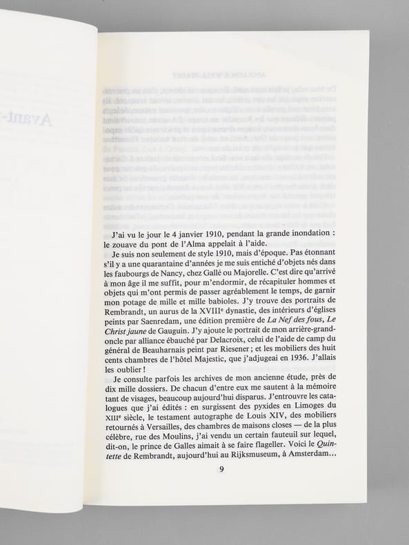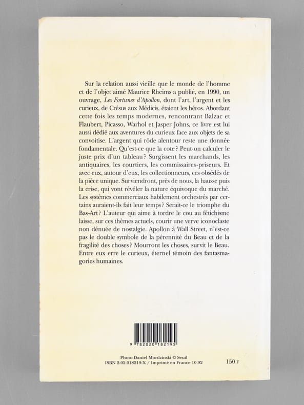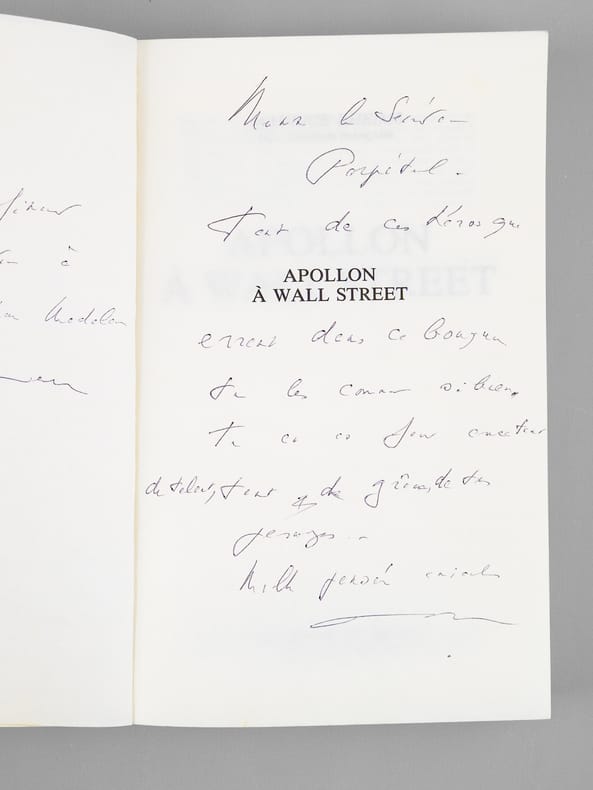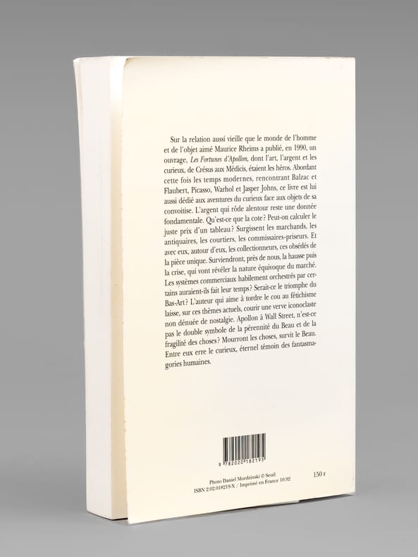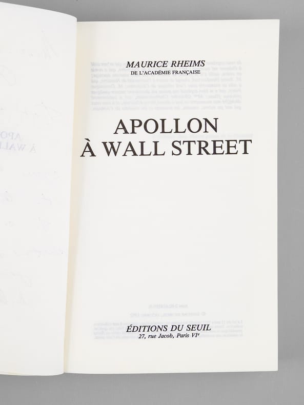 Envoi de Maurice Rheims : "Avec confirmation d'affection à ma Chère Madeleine. Monsieur le Secrétaire Perpétuel, tant de ces héros qui errent dans ce bouquin, tu les connais si bien, tu en es leur créateur de talent, tout de grâce et de [ ... ] Meilleures pensées amicales". Bon état (couv. très lég. frottée, qq. rouss. en tête, bon exemplaire par ailleurs) pour cet exemplaire de superbe provenance : de la bibliothèque du grand écrivain Maurice Druon, Secrétaire Perpétuel de l'Académie Française de 1985 à 1999.