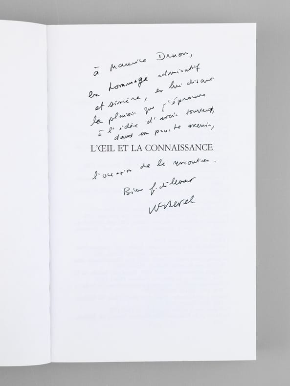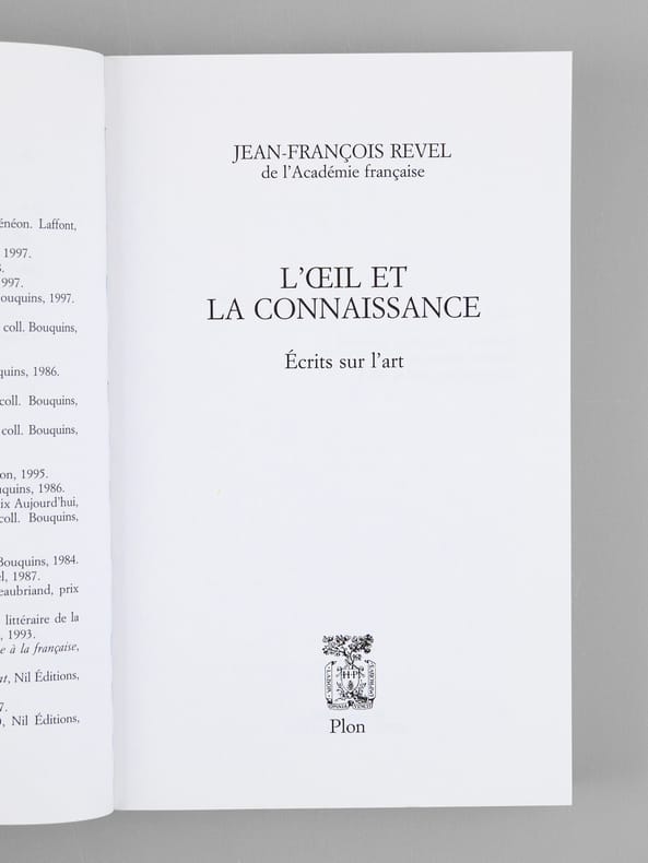 Bel envoi de l'auteur à Maurice Druon : "À Maurice Druon, en hommage admiratif et sincère, en lui disant le plaisir que j'éprouve à l'idée d'avoir souvent, dans un proche avenir , l'occasion de le rencontrer." Etat très satisfaisant (lég. rousseurs sur tr. sup., bon état par ailleurs). L'auteur et le dédicataire furent tous deux académiciens. Maurice Druon (1918-2009), auteur notamment de la célèbre saga historique des Rois maudits, avait été élu à l'Académie Française en 1968, et en devint le secrétaire perpétuel, de 1985 à 1999. Jean-François Revel, quant à lui, venait d'être élu (en 1997), ce qui explique la teneur de la dédicace . Une belle dédicace, à un dédicataire prestigieux