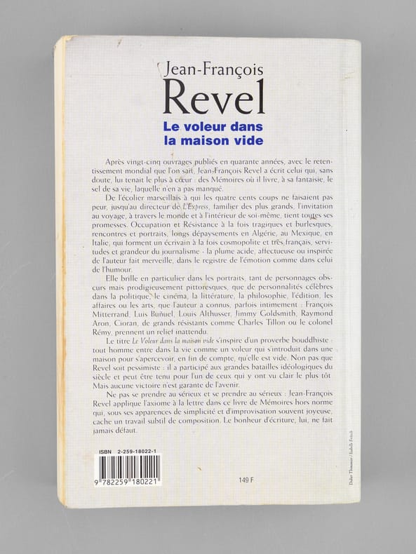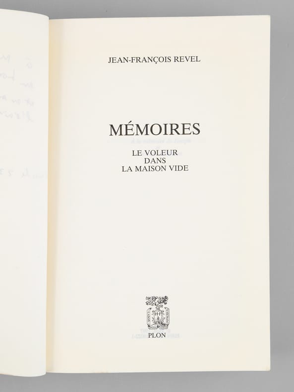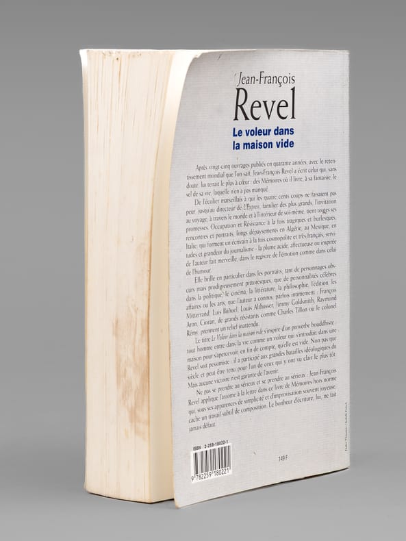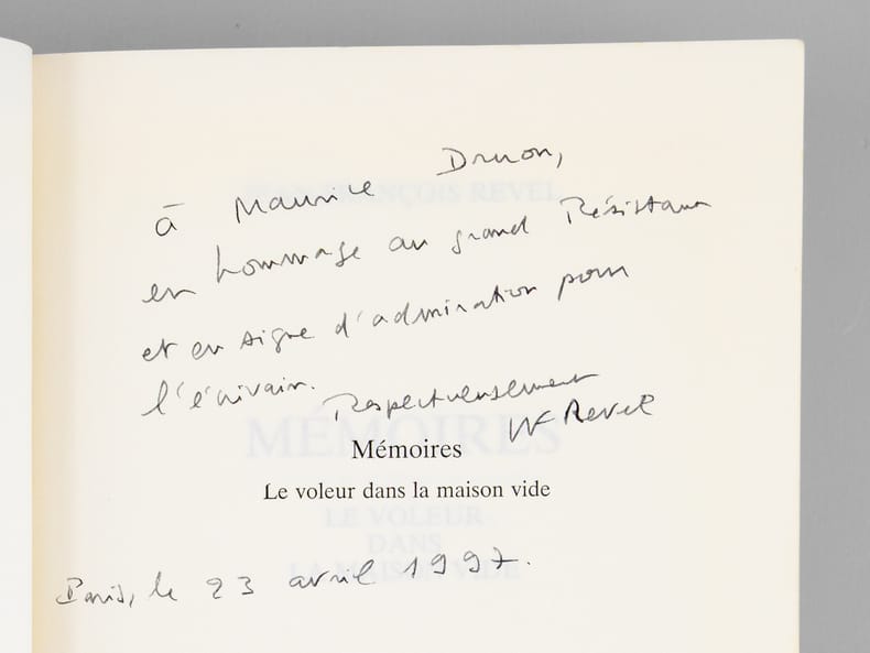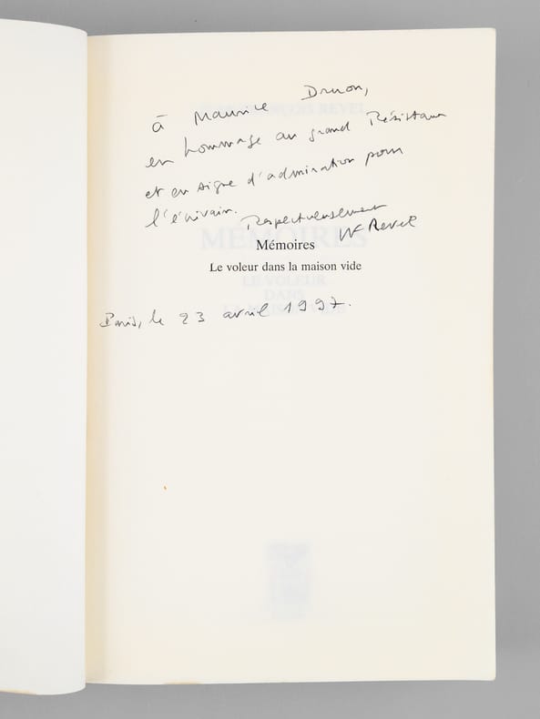 Bel envoi de l'auteur à Maurice Druon : "À Maurice Druon, En hommage aux grands résistants et en signe d'admiration pour l'écrivain. Respectueusement " Etat satisfaisant (traces sur tranches, sup., bon état par ailleurs). L'auteur et le dédicataire furent tous deux académiciens. Maurice Druon (1918-2009), auteur notamment de la célèbre saga historique des Rois maudits, avait été élu à l'Académie Française en 1968, et en devint le secrétaire perpétuel, de 1985 à 1999. Jean-François Revel, quant à lui, sera élu l'année de parution de cet ouvrage (en 1997) . Une belle dédicace, à un dédicataire prestigieux