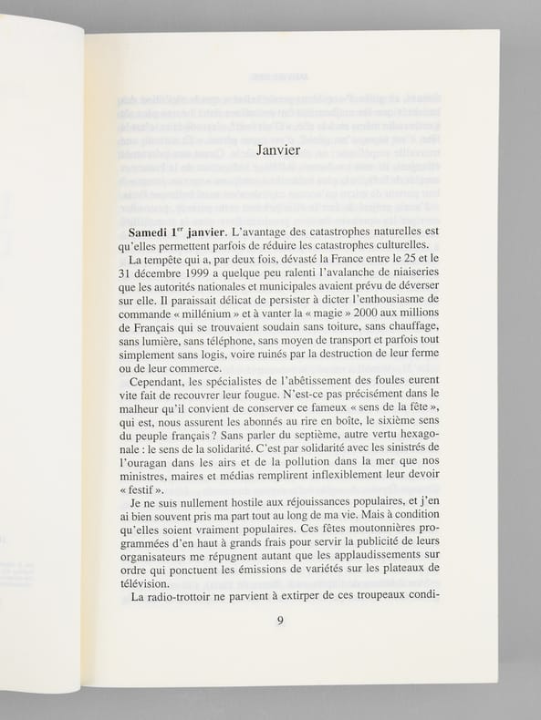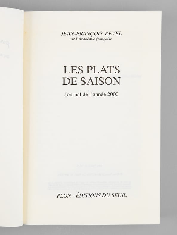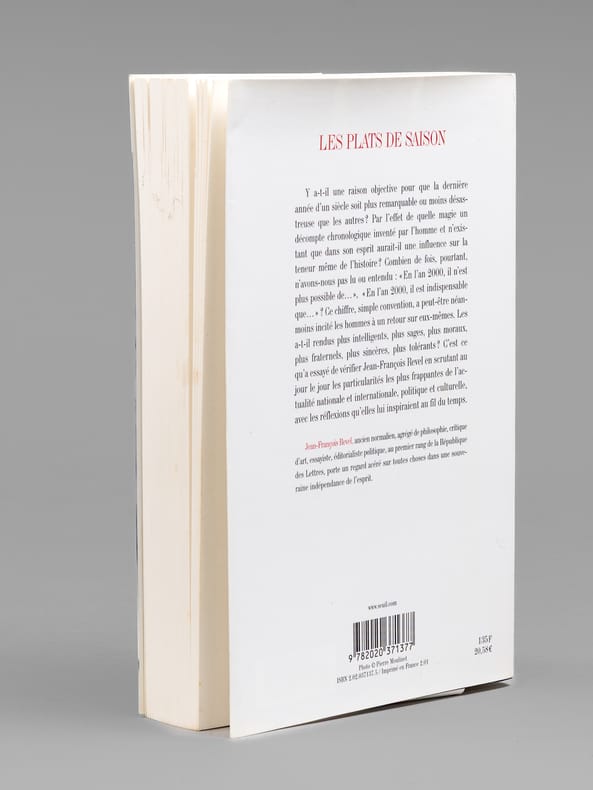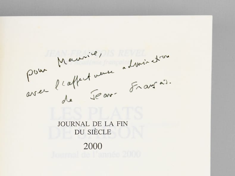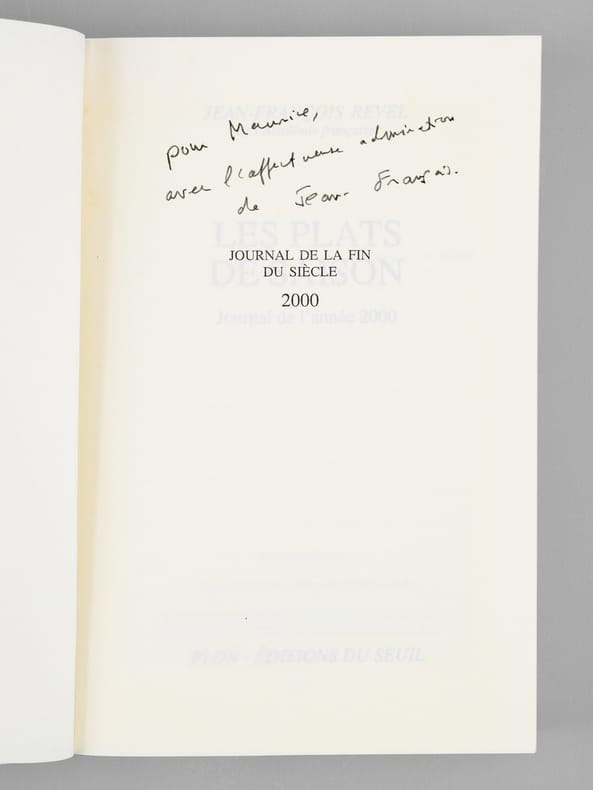 Envoi de l'auteur à Maurice Druon : "Pour Maurice, Avec l'affectueuse admiration de Jean François." Etat très satisfaisant (lég. rousseurs sur tr. sup., bon état par ailleurs). L'auteur et le dédicataire étaient tous deux académiciens. Maurice Druon (1918-2009), auteur notamment de la célèbre saga historique des Rois maudits, avait été élu à l'Académie Française en 1968, et en devint le secrétaire perpétuel, de 1985 à 1999. Jean-François Revel, quant à lui, avait été élu en 1997.