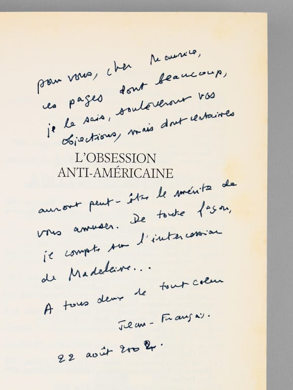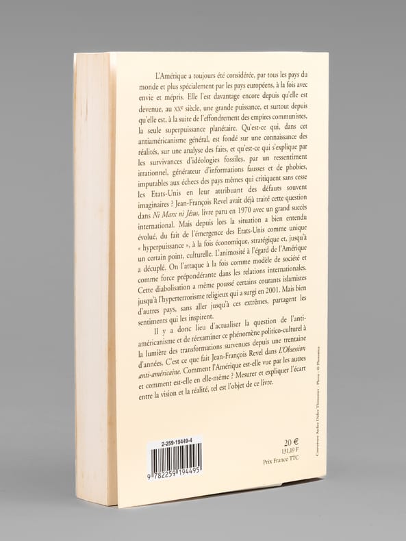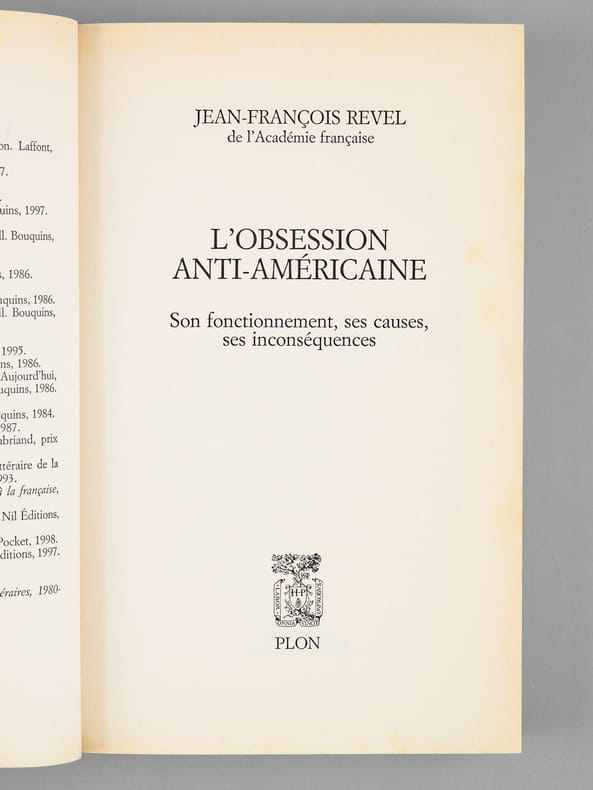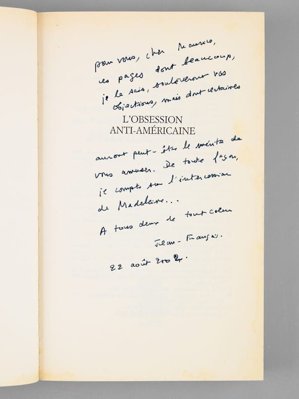 Bel envoi de l'auteur à Maurice Druon : "Pour vous, Cher Maurice Druon, Ces pages dont beaucoup, je le sais, soulèveront vos objections, mais dont certaines auront peut être le mérite de vous amuser. De toute façon, je compte sur l'intercession de Madeleine... A tous deux, de tout cœur." (Madeleine était l'épouse de Maurice Druon). Etat très satisfaisant (lég. rousseurs sur tr., bon état par ailleurs). L'auteur et le dédicataire étaient tous deux académiciens. Maurice Druon (1918-2009), auteur notamment de la célèbre saga historique des Rois maudits, avait été élu à l'Académie Française en 1968, et en devint le secrétaire perpétuel, de 1985 à 1999. Jean-François Revel, quant à lui, avait été élu en 1997. Une belle dédicace à un délicataire prestigieux.