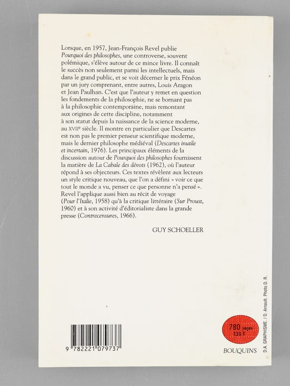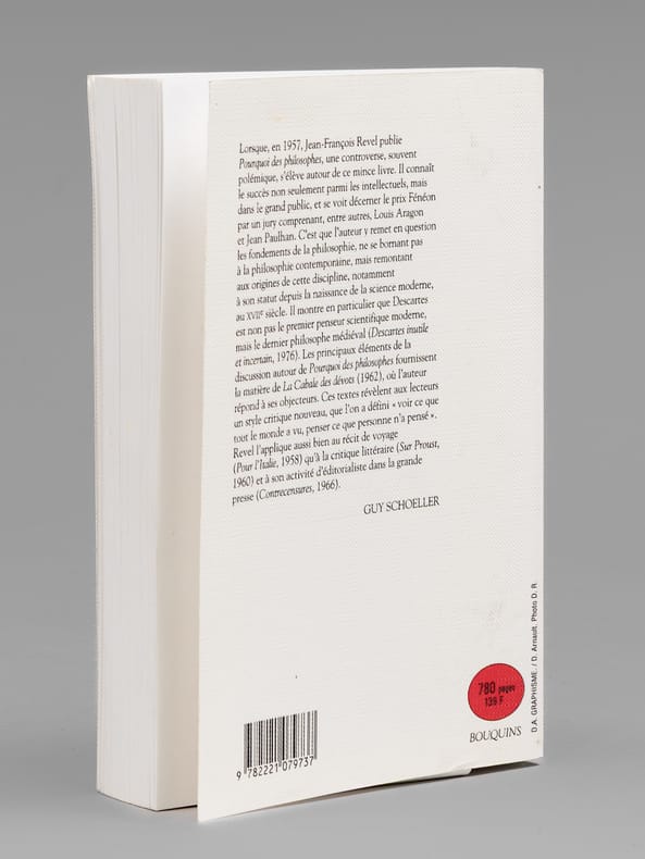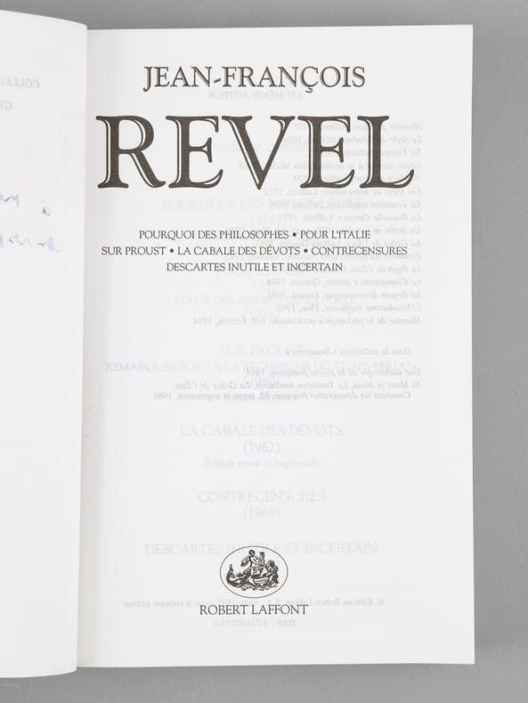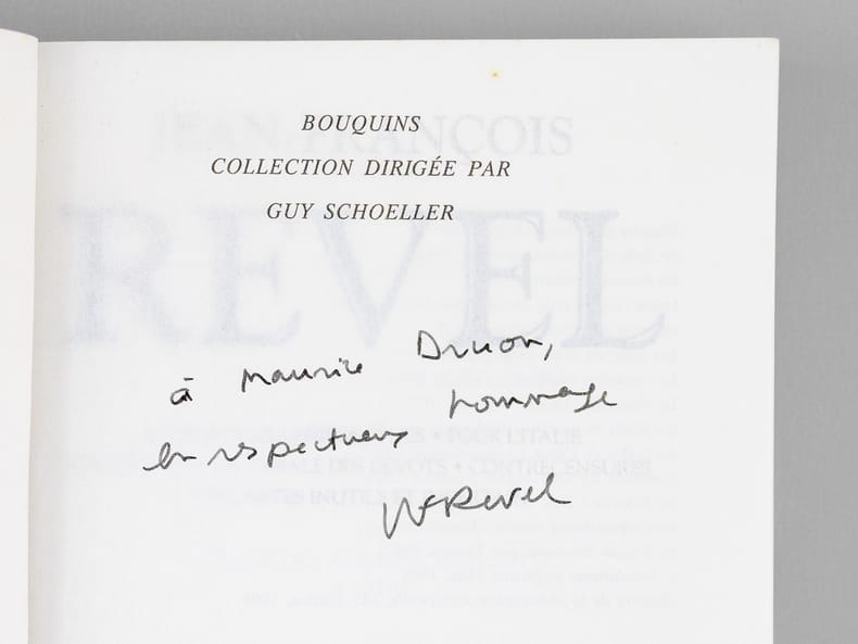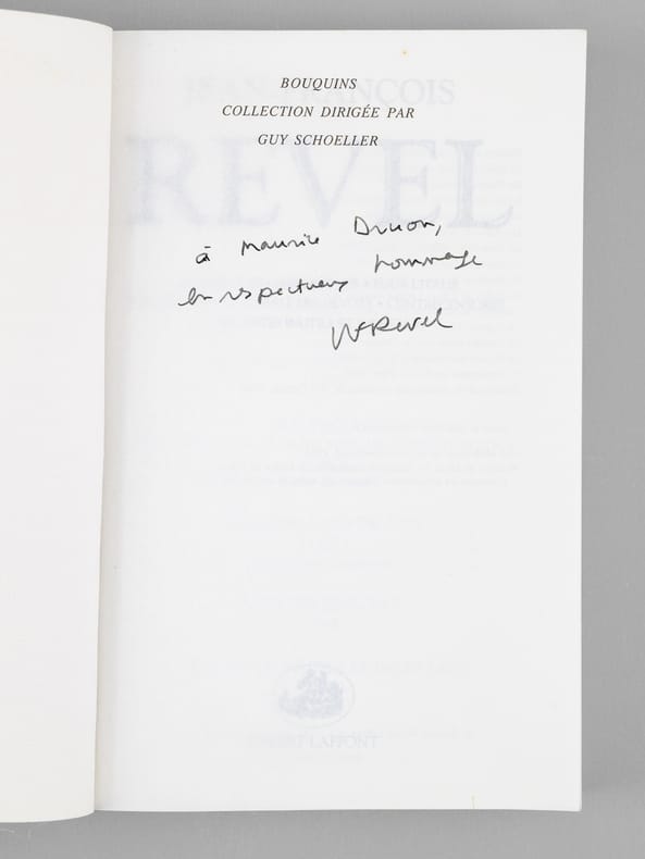 Envoi de l'auteur à Maurice Druon : "À Maurice Druon, En respectueux hommage." Etat très satisfaisant (lég. traces sur tranche sup., bon état par ailleurs). L'auteur et le dédicataire furent tous deux académiciens. Maurice Druon (1918-2009), auteur notamment de la célèbre saga historique des Rois maudits, avait été élu à l'Académie Française en 1968, et en devint le secrétaire perpétuel, de 1985 à 1999. Jean-François Revel, quant à lui, sera élu l'année de parution de cet ouvrage (en 1997).