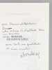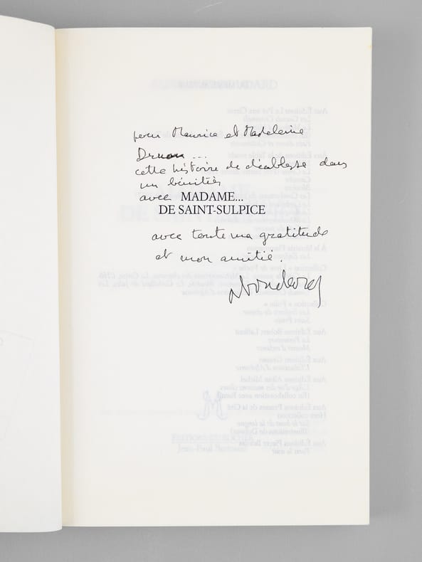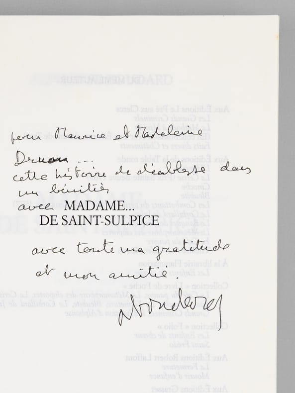Bel envoi de l'auteur à Maurice Druon et à son épouse: "Pour Maurice et Madeleine Druon, Cette histoire de diablesse dans un bénitier , Avec Mme de Saint-Sulpice , Avec toute ma gratitude et mon amitié." Etat très satisfaisant (lég. rouss. sur tr. sup., bon état par ailleurs). Maurice Druon (1918-2009), auteur notamment de la célèbre saga historique des Rois maudits, avait été élu à l'Académie Française en 1968, et en devint le secrétaire perpétuel, de 1985 à 1999.