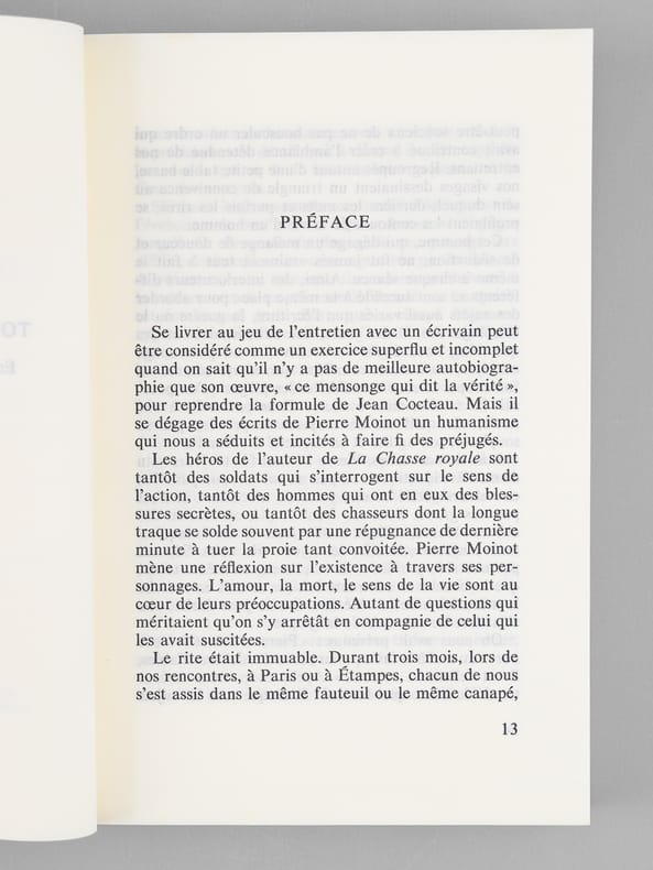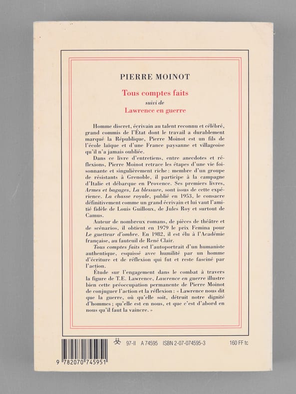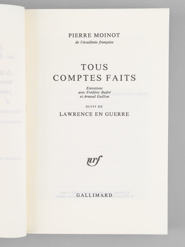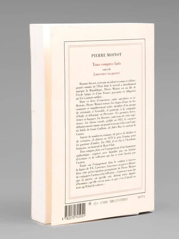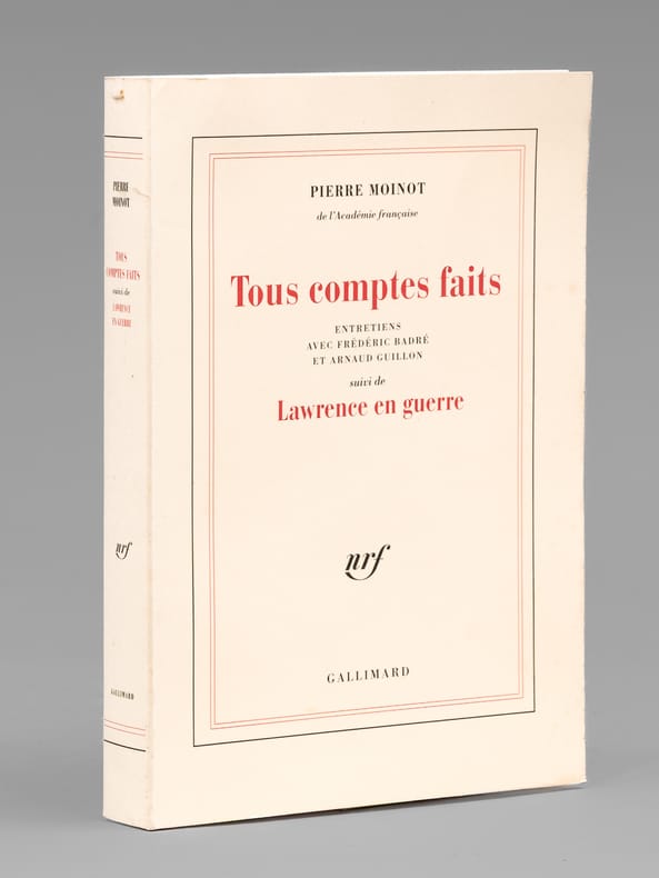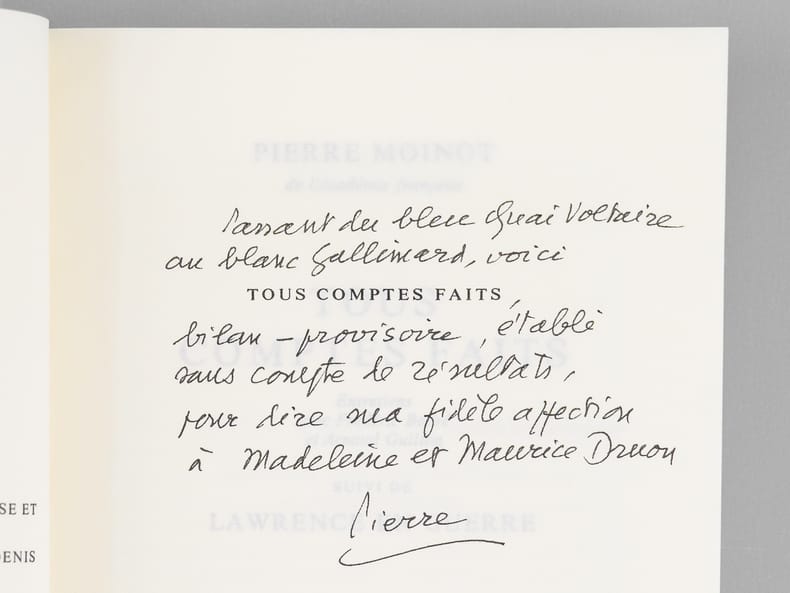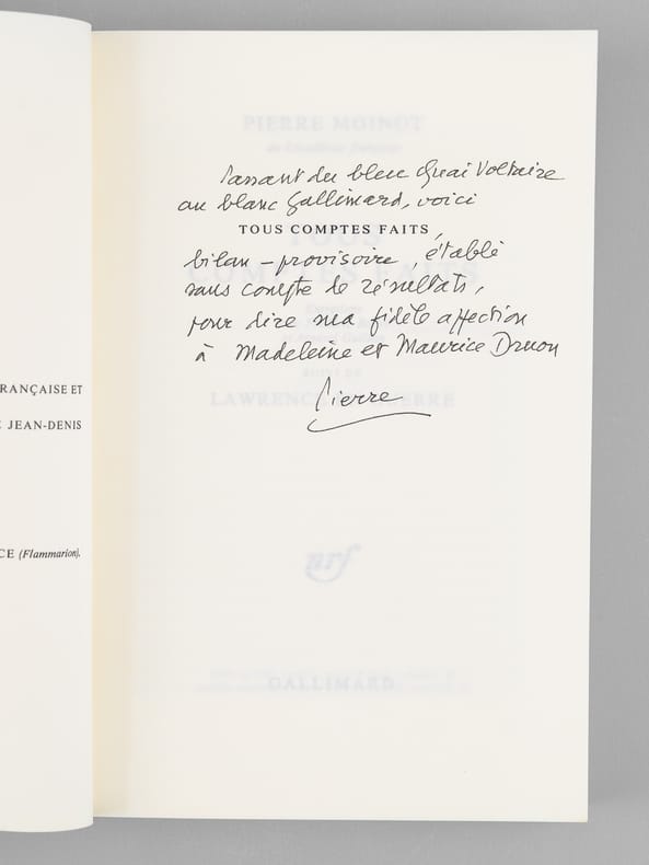 Envoi de l'auteur à Maurice Druon et à son épouse : "Passant du bleu qu'est Voltaire au blanc Gallimard voici tous comptes faits, Bilan provisoire, établi sans compte de résultats, pour dire ma fidèle affection à Madeleine et Maurice Druon". Etat très satisfaisant (lég. rouss. sur tr., bon état par ailleurs). Maurice Druon (1918-2009), neveu de Joseph Kessel, fut résistant, écrivain auteur notamment de la saga des Rois maudits, homme politique. Elu à l'Académie Française en 1968, il en devint le Secrétaire Perpétuel en 1985. Quant à Pierre Moinot, résistant puis haut-focntionnaire, il fut élu à l'Académie en 1982. Exemplaire avec un bel envoi à un destinataire prestigieux.