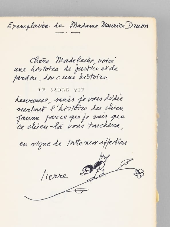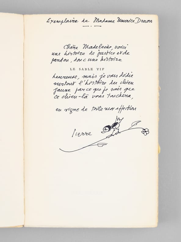 Envoi illustré de l'auteur à l'épouse de Maurice Druon : "Chère Madeleine, Voici une histoire de justice et de pardon, donc une histoire heureuse. Mais je vous dédie surtout l'histoire du chien jaune parce que je sais que ce chien-là vous touchera. En signe de toute mon affection. Pierre [dessin de moineau]. " Etat très satisfaisant (couv. lég. frottée, bon état par ailleurs). Comme la dédcataire, né Madeleine Marginac, n'a épousé Maurice Druon qu'en 1968, la dédicace doit donc être postérieure, mais n'est pas datée. Madeleine Druon (1925-2016) faisait partie de l'équipe qui dès 1955, participa à la rédaction des premiers volumes de "Rois maudits".