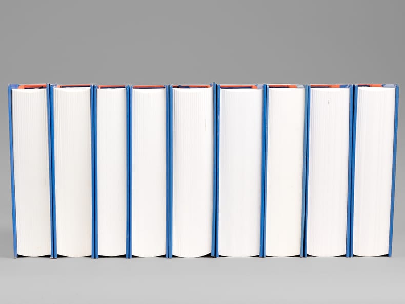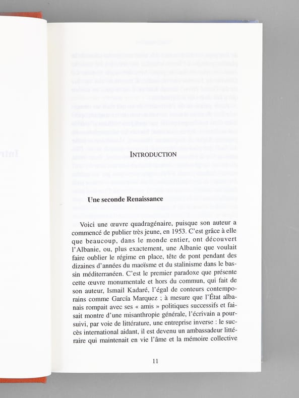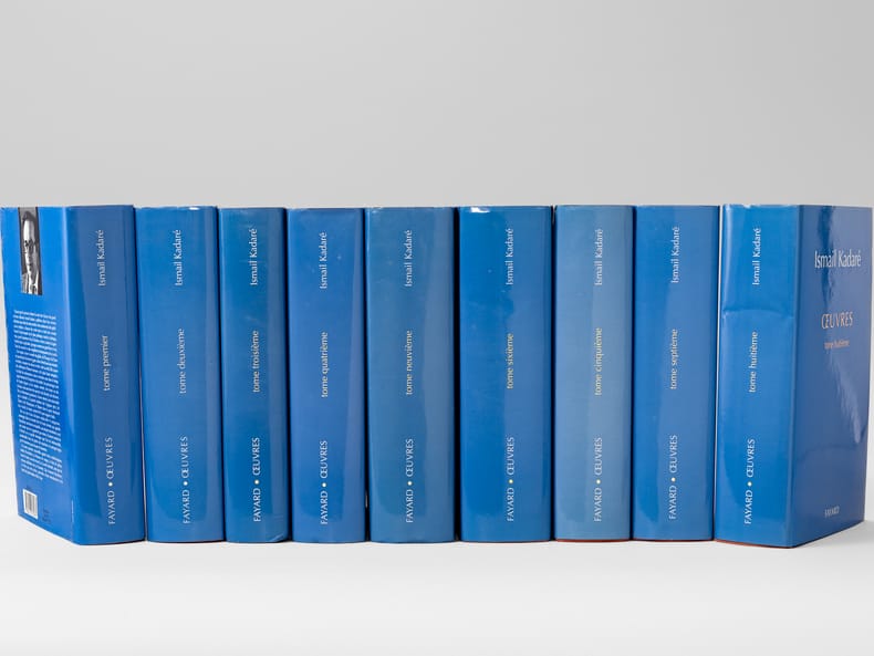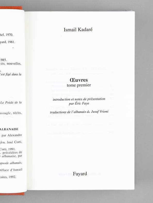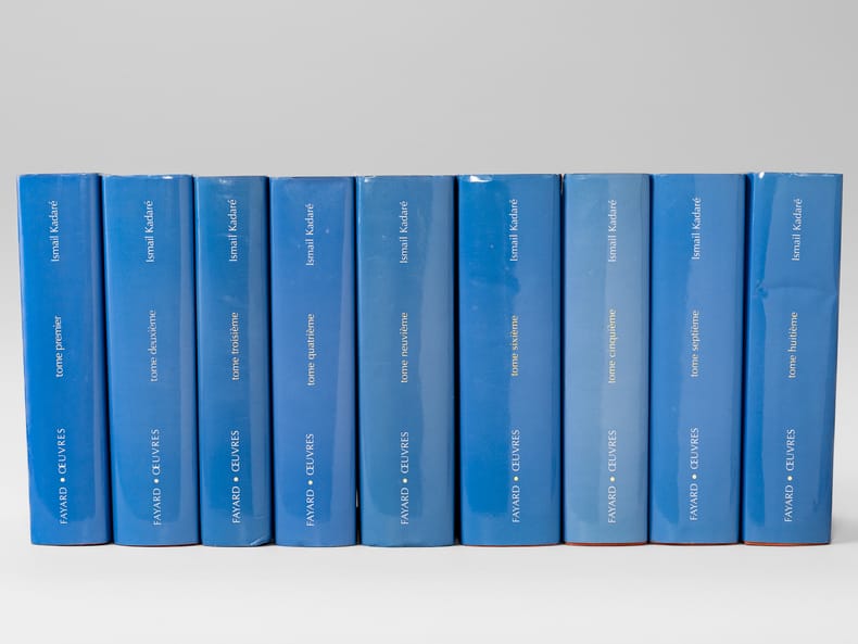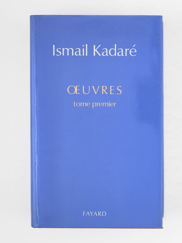 Introduction et notes de présentation par Eric Faye, traductions de l'albanais de Jusuf Vrioni, 9 vol. fort in-8 reliure pleine toile orange éditeur sous jaquette bleue, Fayard, Paris, 1993, 1994, 1995, 1996, 1997, 1998, 1999, 2000 : Oeuvres (Tomes 1 à 9 ) [ 8 des 9 volumes dédicacés par l'auteur à Maurice Druon ] Tome 1 : Récits d'outre-temps - La Pyramide - Qui a ramené Doruntine ? - Le Pont aux trois arches - La Grande Muraille ; Tome 2 : Les Tambours de la pluie - Récits de la nuit tombante - La Niche de la Honte ; Tome 3 : La Commission des fêtes - Le Firman aveugle - Le Palais des rêves - Le Vol du sommeil royal - La Chaîne des Hankoni - L'Abolition du métier d'imprécateur - Les Adieux du mal ; Tome 4 : L'Année noire - Avril brisé - Le Dossier H. - Le Chant - Les Passages souterrains - Concours de beauté masculine aux Cimes maudites ; Tome 5 : Chronique de pierre - Novembre d'une capitale - Trois temps ; Tome 6 : La Ville sans enseignes - Le Général de l'armée morte - Le Crépuscule de l'armée morte - Le Crépuscule des dieux de la steppe - Le Monstre ; Tome 7 : Le Temps des querelles I ; Tome 8 : Le Temps des querelles, II ; Tome 9 : La Peau de tambour - Onze courts récits