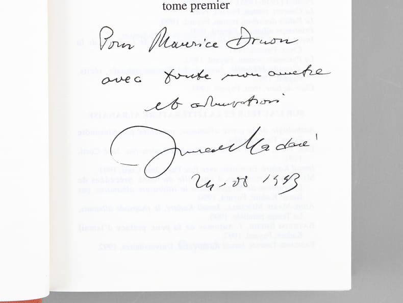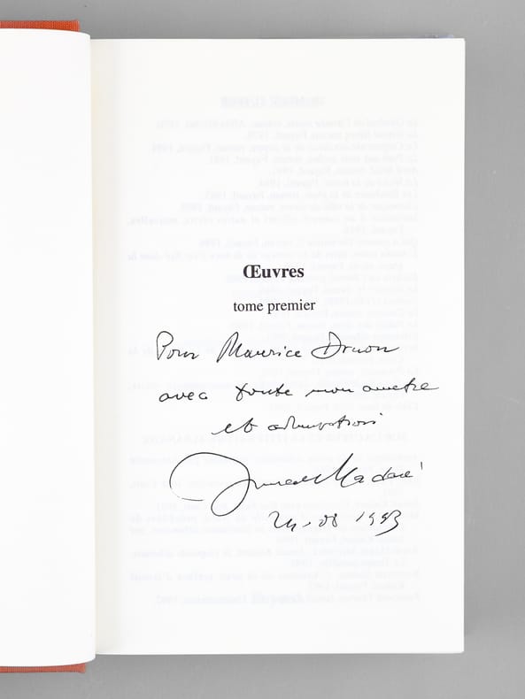 Remarquable ensemble, réunissant les 9 premiers tomes (sur les 12 parus) d'Oeuvres d'Ismail Kadaré publiées par Fayard : tous les volumes, à l'exception du seul tome 8, sont dédicacés par le célèbre écrivain albanais au grand écrivain Maurice Druon, immortel co-auteur du "Chant des Partisans" et des "Rois Maudits", Secrétaire Perpétuel de l'Académie Française de 1985 à 1999. Ismail Kadaré fut élu en 1996 membre associé étranger de l'Académie des Sciences morales et politiques, au siège de Karl Popper. Bon état (petite pliure au dos d'un tome, très bon état par ailleurs). Voir également dans notre catalogue le tome 12, dédicacé.