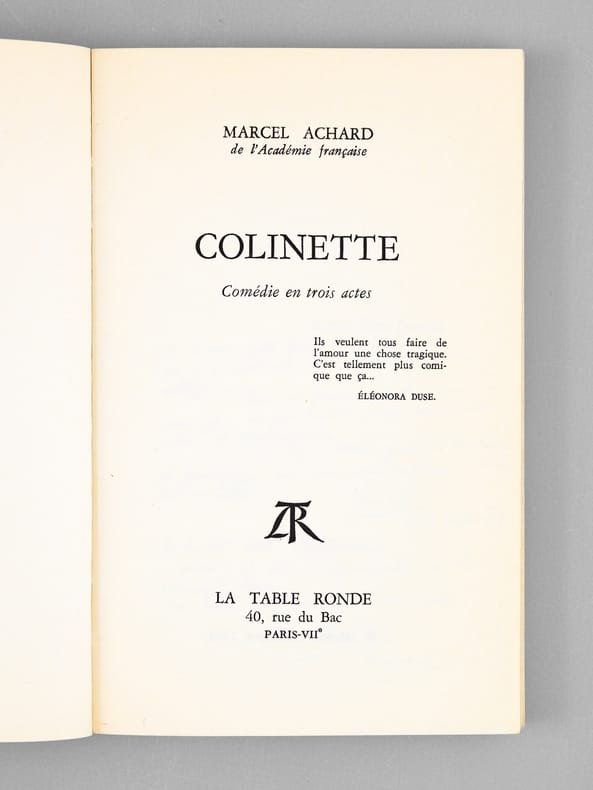 Superbe envoi de Marcel Achard ""A mon frère Ferréol" et à mon petit frère élu Maurice qui m'a soutenu, comme Ferréol aux collèges. Pour son grand talent, son courage, sa pénétration, son sens politique et historique, avec ma très grande tendresse si justifie et mon admiration inconditionnelle. A la très belle Madeleine dont j'ai été l'aficionado de la première heure, si belle, si tendre, si amicale. Affection". De la bibliothèque du grand écrivain Maurice Druon, Secrétaire Perpétuel de l'Académie Française de 1985 à 1999 et confrère de l'académicien Marcel Achard.