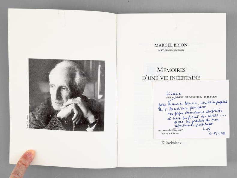 Le premier volume est accompagné d'une carte autographe signée de Madame Liliane Marcel Brion (Liliane Brion-Guerry) "pour Maurice Druon, Secrétaire Perpétuel de l'Académie Française, ces pages émouvantes destinées à ceux qui furent ses amis... Avec la fidélité de mon affectueuse gratitude". Bon ensemble (couv. lég. frottée) pour cet ensemble de provenance prestigieuse : de la bibliothèque du grand écrivain Maurice Druon, Secrétaire Perpétuel de l'Académie Française de 1985 à 1999.