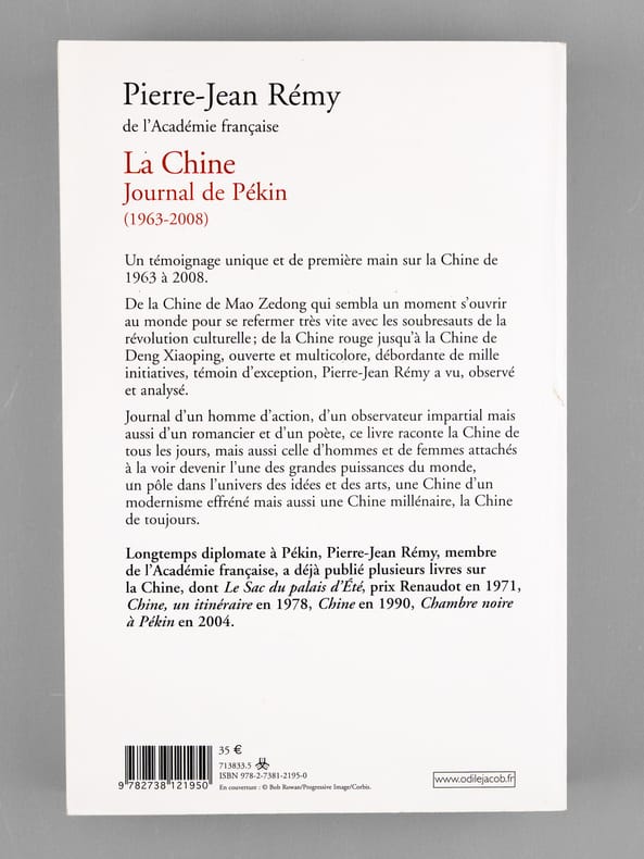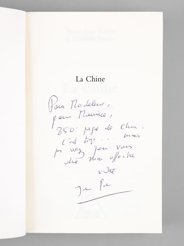 Bel envoi de Pierre-Jean Rémy, "Pour Madeleine, pour Maurice, 850 pages de Chine, c'est trop... mais pas assez pour vous dire mon affection". Bon état pour cet exemplaire de provenance prestigieuse : de la bibliothèque du grand écrivain Maurice Druon, Secrétaire Perpétuel de l'Académie Française de 1985 à 1999.