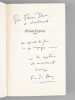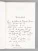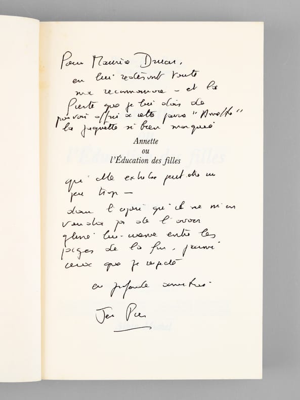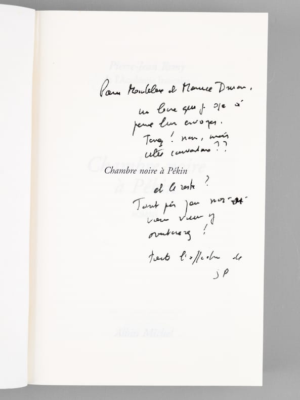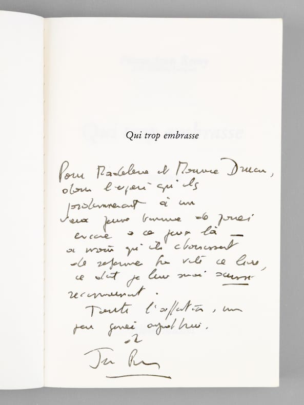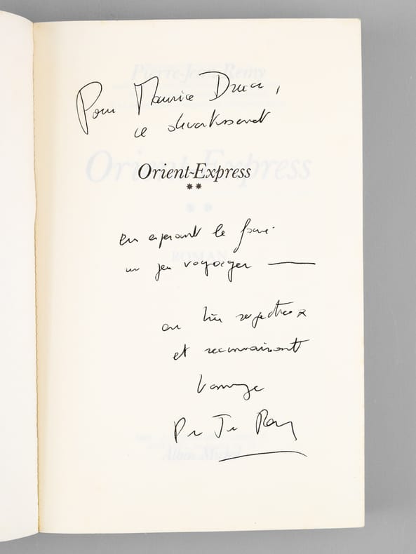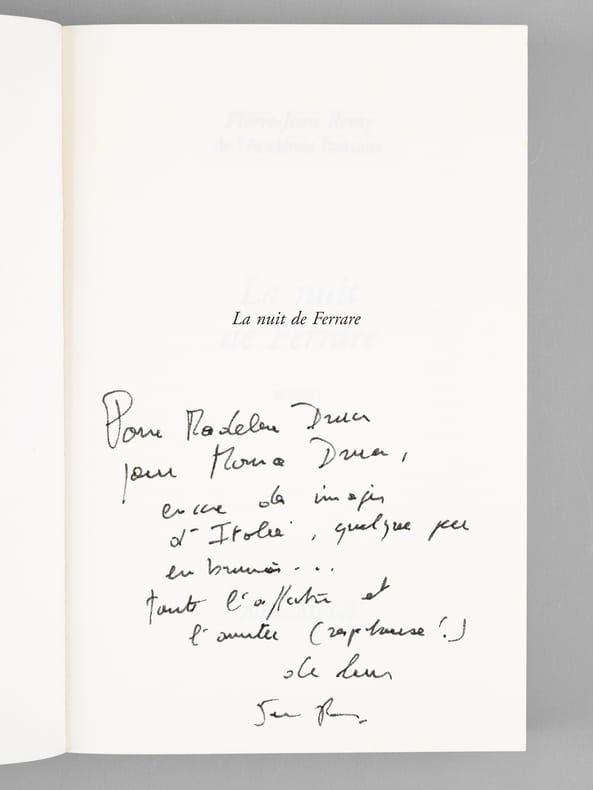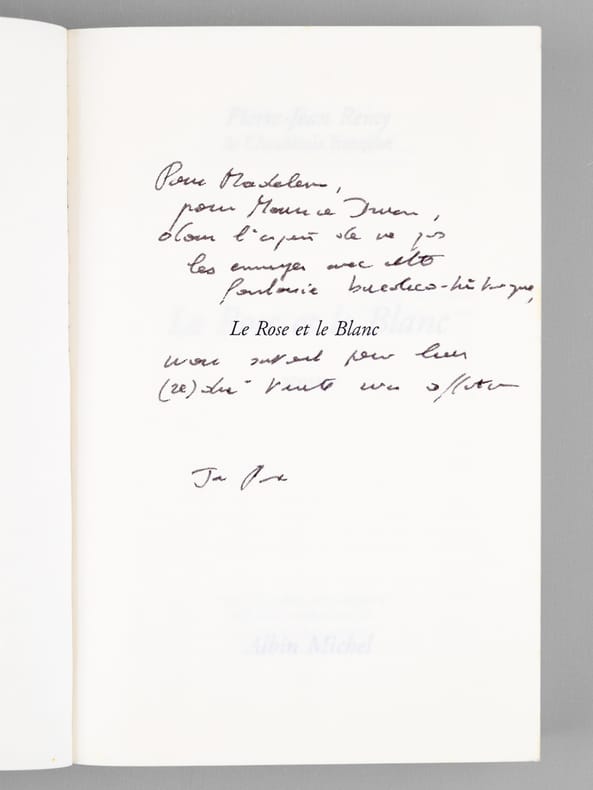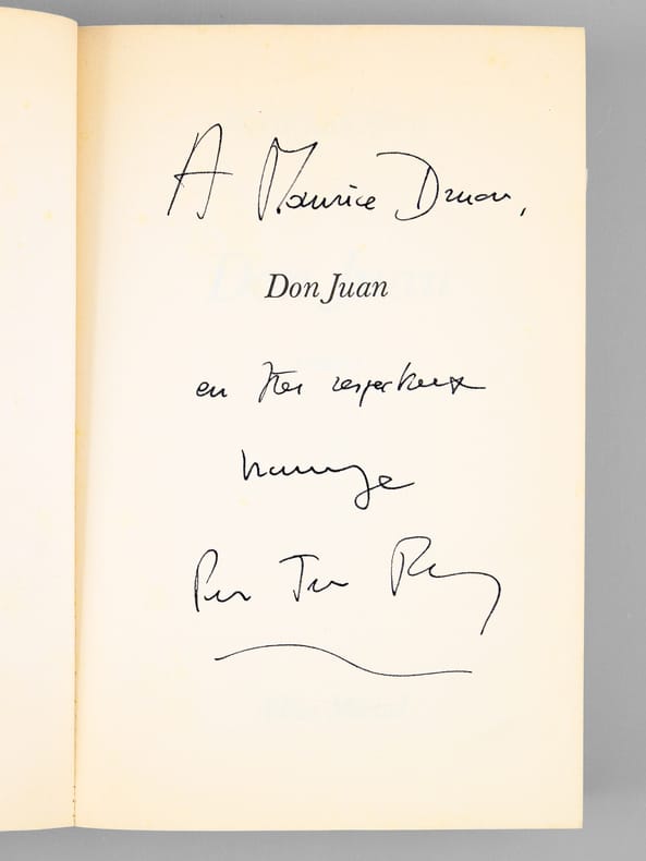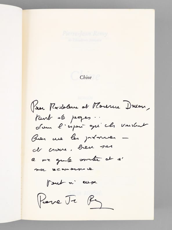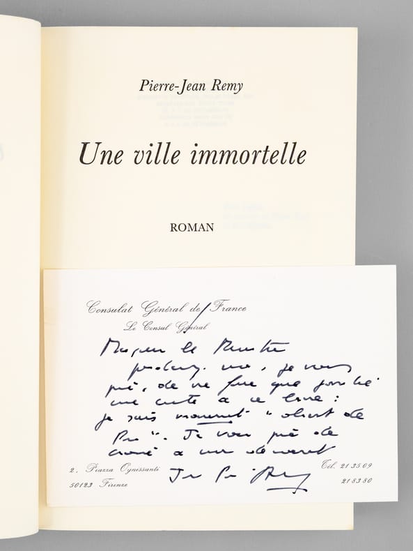 Bon ensemble réunissant ces 10 romans, tous dédicacés ou accompagné pour l'un d'une carte autographe signée par Pierre-Jean Rémy à Maurice Druon (et à son épouse). Etat très satisfaisant (petites usures en dos, petit accroc sur une jaquette, qq. rouss. sur tranche) pour cet ensemble de provenance prestigieuse : de la bibliothèque du grand écrivain Maurice Druon, Secrétaire Perpétuel de l'Académie Française de 1985 à 1999, auteur des "Rois Maudits" et co-auteur avec son oncle Joseph Kessel du "Chant des Partisans".