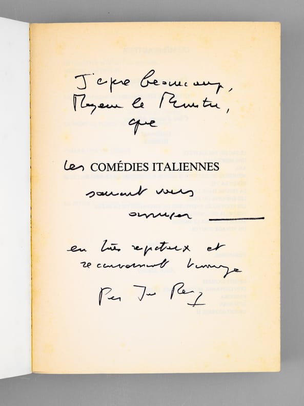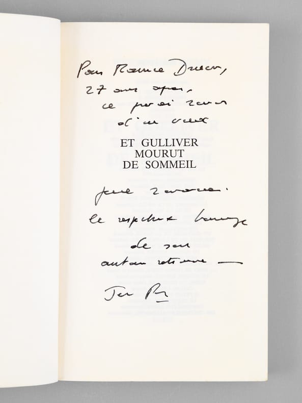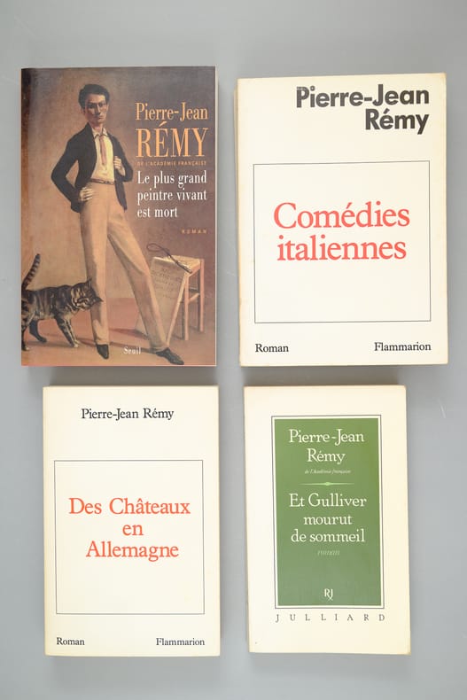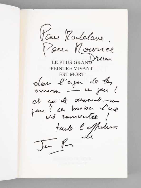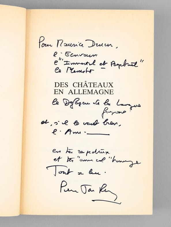 Bon ensemble réunissant ces 4 romans, tous enrichis d'une belle dédicace de Pierre-Jean Rémy à Maurice Druon (et à son épouse). Bon état (qq. petits frott. en couv. et qq. rouss. sur tranches) pour cet ensemble de provenance prestigieuse : de la bibliothèque du grand écrivain Maurice Druon, Secrétaire Perpétuel de l'Académie Française de 1985 à 1999, auteur des "Rois Maudits" et co-auteur avec son oncle Joseph Kessel du "Chant des Partisans". Conformément à sonhabitude, Maurice Druon a replié dans 2 volumes l'angle des feuillets dont la lecture avait plus particulièrement retenu son attention.