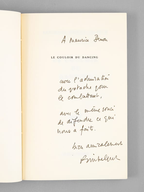 Bel envoi de l'Académicien Bertrand Poirot-Delpech à Maurice Druon : "A Maurice Druon, avec l'admiration du potache pour le combattant, avec le même souci de défendre ce qui nous a faits". Bon état (qq. rouss. en couv.) pour cet exemplaire de provenance prestigieuse : de la bibliothèque du grand écrivain Maurice Druon, Secrétaire Perpétuel de l'Académie Française de 1985 à 1999, auteur des "Rois Maudits" et co-auteur avec son oncle Joseph Kessel du "Chant des Partisans".