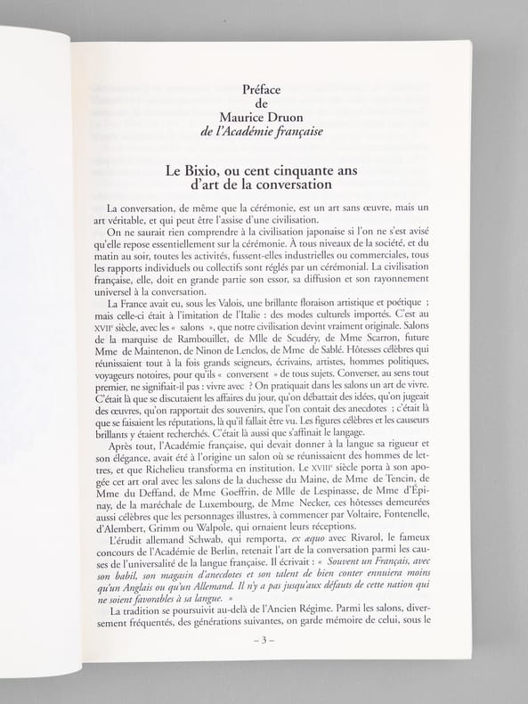 Rare exemplaire de cet ouvrage présentant une liste des "membres du Bixio de sa création à nos jours", voulu et préfacé par Maurice Druon. De la bibliothèque du grand écrivain Maurice Druon, Secrétaire Perpétuel de l'Académie Française de 1985 à 1999, auteur des "Rois Maudits" et co-auteur avec son oncle Joseph Kessel du "Chant des Partisans". Fondé en 1856 par Alexandre Bixio, le "dîner Bixio" réunit une fois par mois, faubourg Saint-Honoré, une douzaine de convives, tous "gens d'esprit".