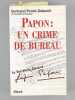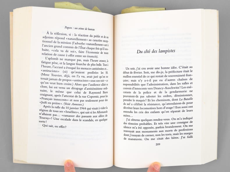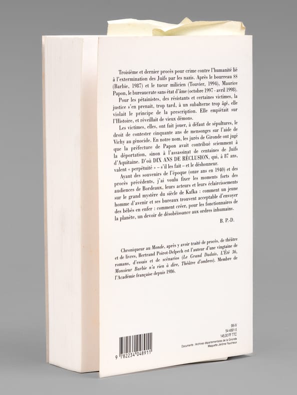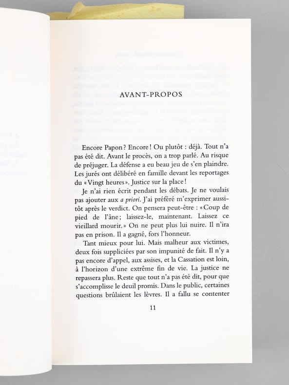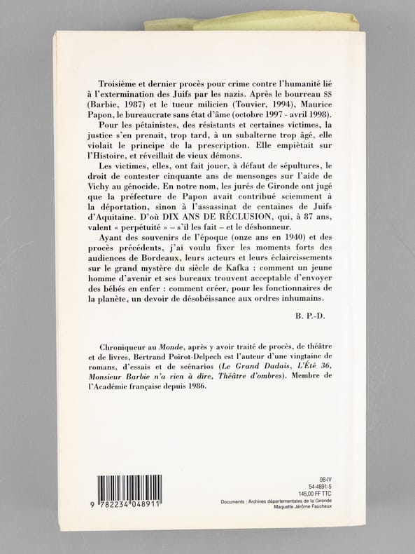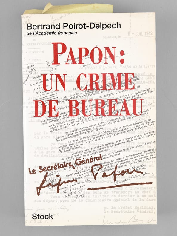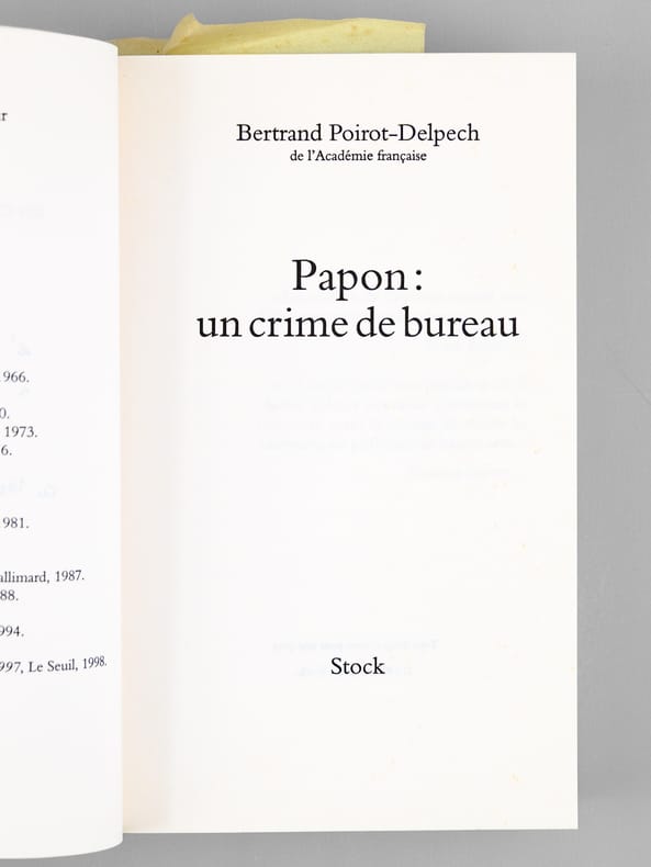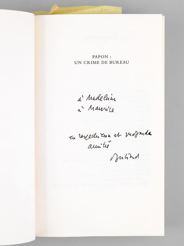 Bel envoi de l'Académicien Bertrand Poirot-Delpech à : "A Madeleine, à Maurice. En respectueuse et profonde amitié". Bon état (qq. rouss. sur tranche) pour cet exemplaire de provenance prestigieuse : de la bibliothèque du grand écrivain Maurice Druon, Secrétaire Perpétuel de l'Académie Française de 1985 à 1999, auteur des "Rois Maudits" et co-auteur avec son oncle Joseph Kessel du "Chant des Partisans". Maurice Druon, qui témoignera lors du procès Papon, a signalé deux passages par l'apposition de deux "post-it".